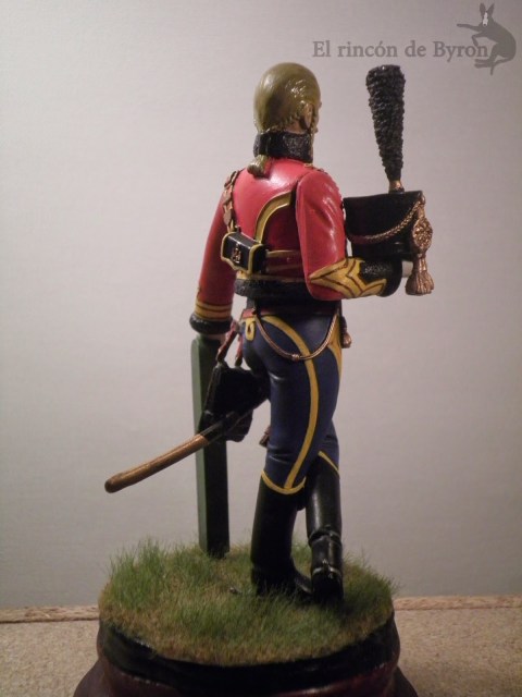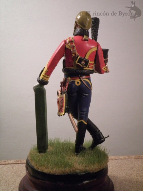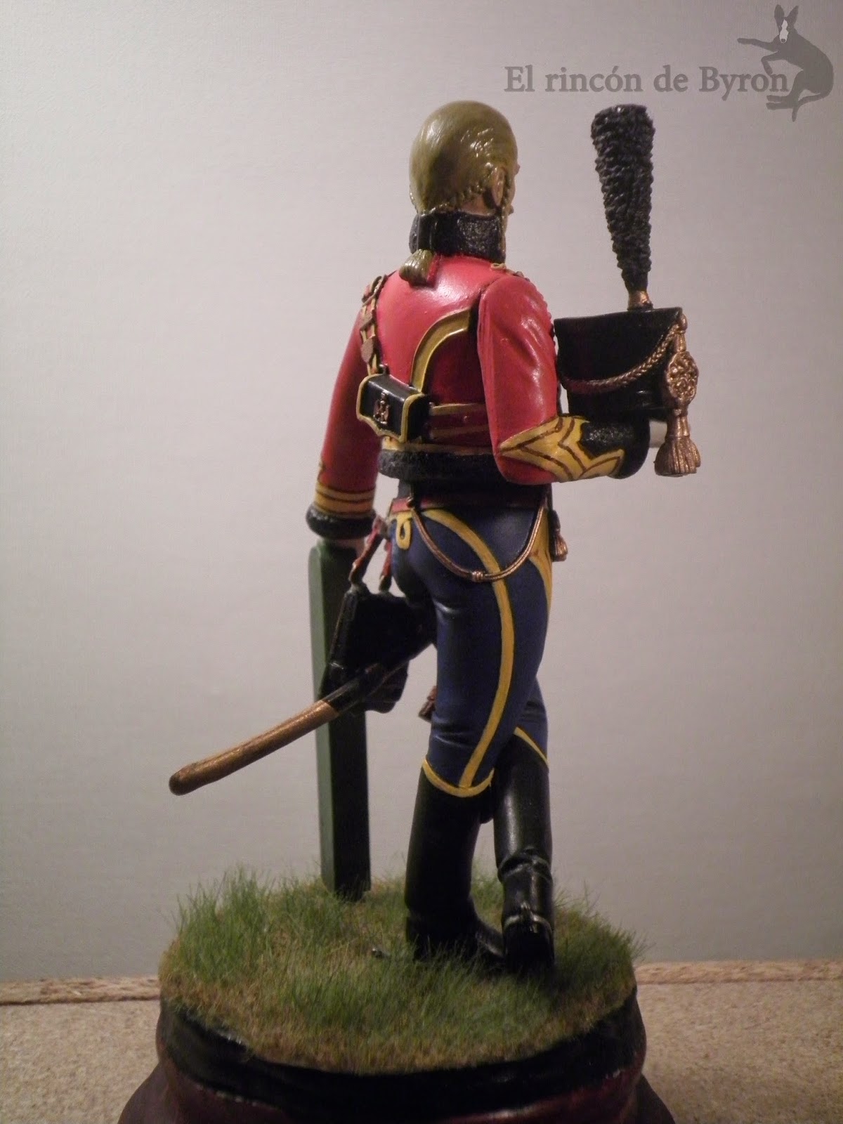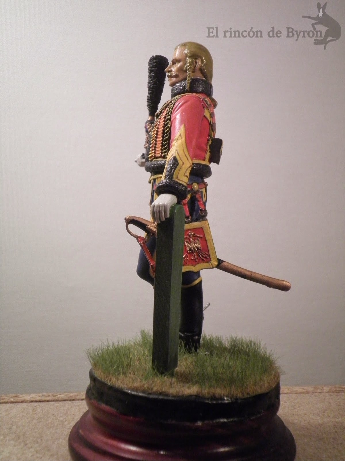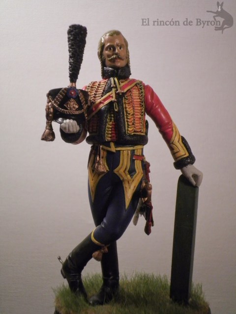 Representa un capitán del 4º de Húsares en traje de gala, de la marca Verlinden. El primer problema que se planteó fué el de la uniformidad, ya que la figura sólo viene con una foto de un modelo pintado sin ninguna guía de colores ni referencia alguna. Tras consultar alguna bibliografía sobre el tema se llega una pseudo-interpretación de cómo debía ser, ya que hay múltiples variantes en el transcurso de los años según las fuentes consultadas, y este uniforme en concreto debió ser de una versión del año 1810 (more or less). Está pintado con acrílicos, y no hay mucho más que explicar, a excepción del calvario para encontrar un color amarillo dorado que tuviera una mínima consistencia, ya que es uno de los colores básicos en el uniforme. El que se dedique al mundo del warhammer o a pintar figuritas ya me entenderá probablemente. No hubo manera de encontrar uno en condiciones 😕, así que tiré por un amarillo limón que no era ni mucho menos el requerido, pero fué el único que a la postre agarraba en la figura. Os dejo con la figura.