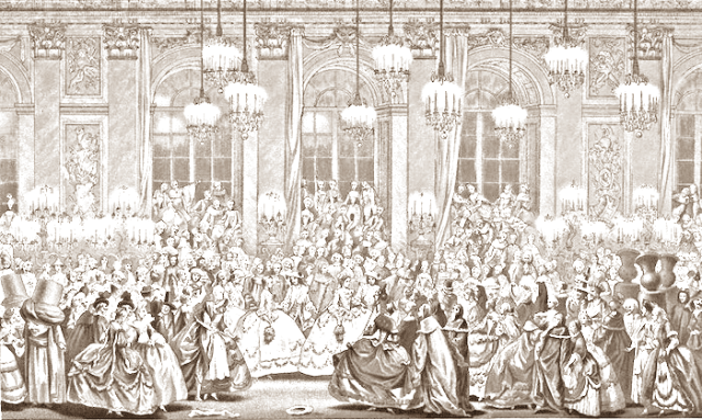 »Obedecí, y por la noche, me dirigí, con Su Majestad, hasta la casa de Monsieur de Mareschalchi. Lo arreglé lo mejor que pude, con un disfraz negro, y me esforcé en dejarlo completamente irreconocible. Todo iba perfectamente, a pesar de las numerosas observaciones formuladas por el emperador sobre la ridiculez del disfraz y la mala facha que da un dominó. Pero cuando se trató de cambiar el vestido, se negó radicalmente, a pesar de todo lo que dije al respecto. Por ello fue reconocido así que entró en el baile. Se dirigió directamente hacia una máscara con las manos en la espalda, según su costumbre. Quiere iniciar una intriga, pero a la primera pregunta que formula, se le responde tratándolo de sire.