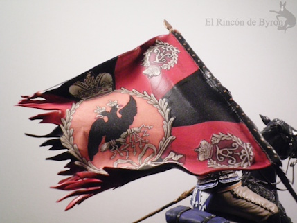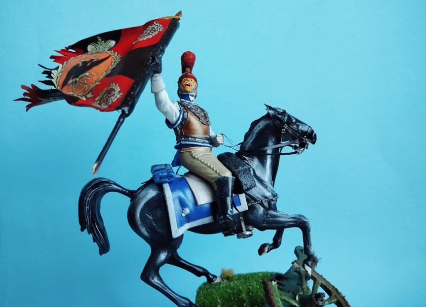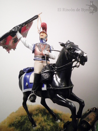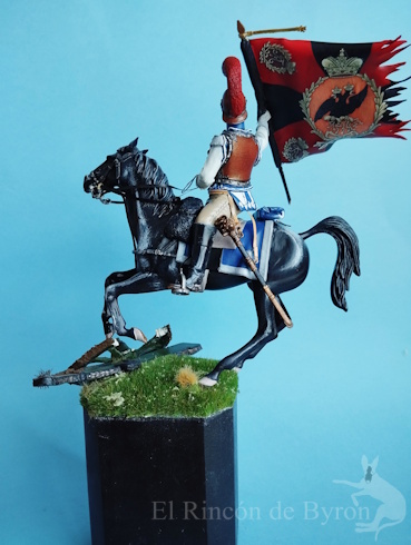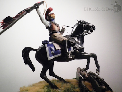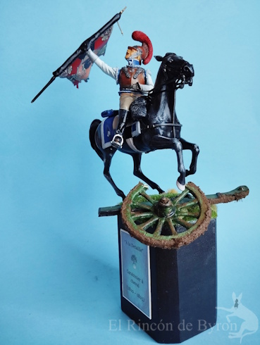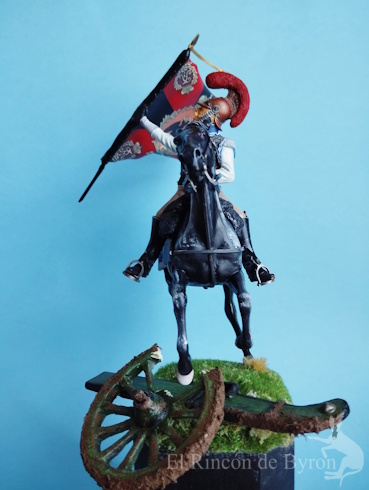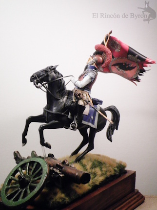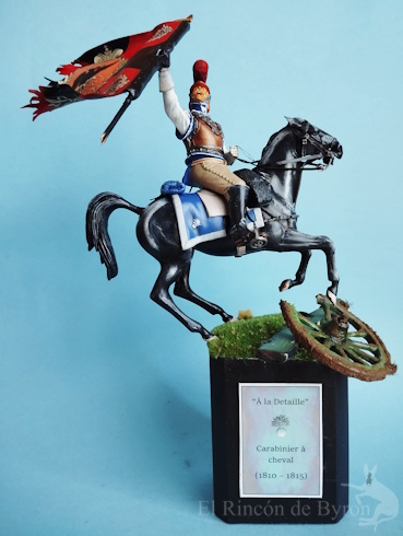 La miniatura es un Carabinier general de resina de la marca Verlinden, de un tamaño de 120 mm, y el cañón inicial que colocamos era una réplica propia de un modelo en metal. El montaje de la figura nos dio algo de trabajo para componer la figura a caballo, ya que, a esta escala, las figuras son grandes y las dos mitades del cuerpo no encajaban bien entre sí, pero con paciencia y masilla nos apañamos. Luego pintamos la figura con acrílicos de Vallejo y Citadel. Se cambió el motivo original de la figura que blandía una espada recta por una bandera en plástico de 1 mm a escala, haciendo varios cortes en su extremo y dándole la forma con un secador de aire caliente.