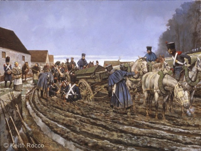 El cuadro, aparte de su mérito artístico en sí, tiene dos puntos originales: uno, el tratar una unidad militar de apoyo o de suministro fuera del escenario de una batalla campal; el segundo, ver que las inclemencias del tiempo podían condicionar sobremanera el desplazamiento de éstas unidades en un frío invierno de febrero de 1814 en Francia.