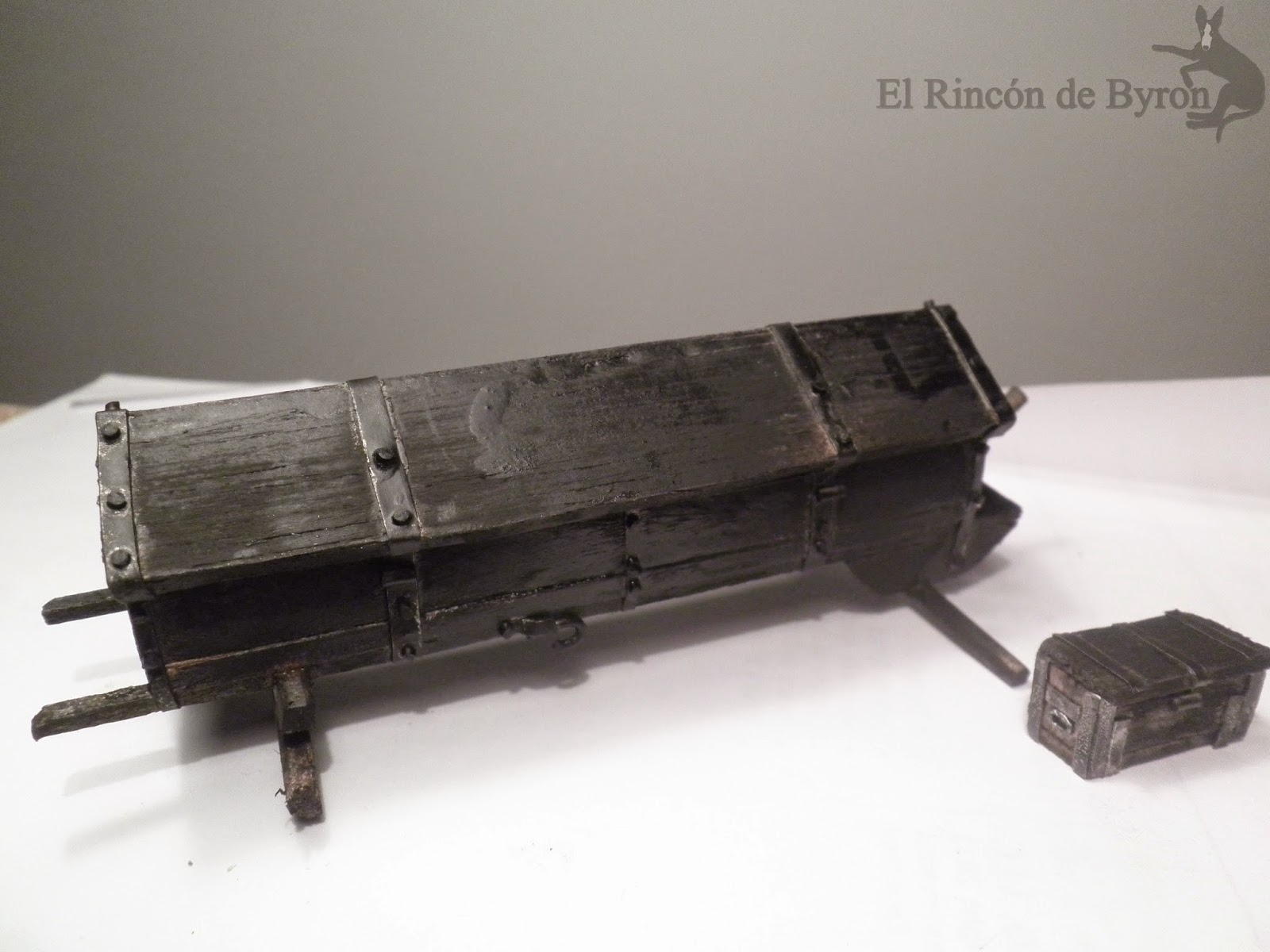 Una vez acabado lo dejamos con la imprimación negra para ser posteriormente pintado en el tradicional verde oliva y añadir el timón de recambio, pico y pala. Las dimensiones finales aproximadas del cajón -sin la suspensión – son de unos 10 cm. de largo por 2,5 cm. de ancho y 2,5 cm. de alto.