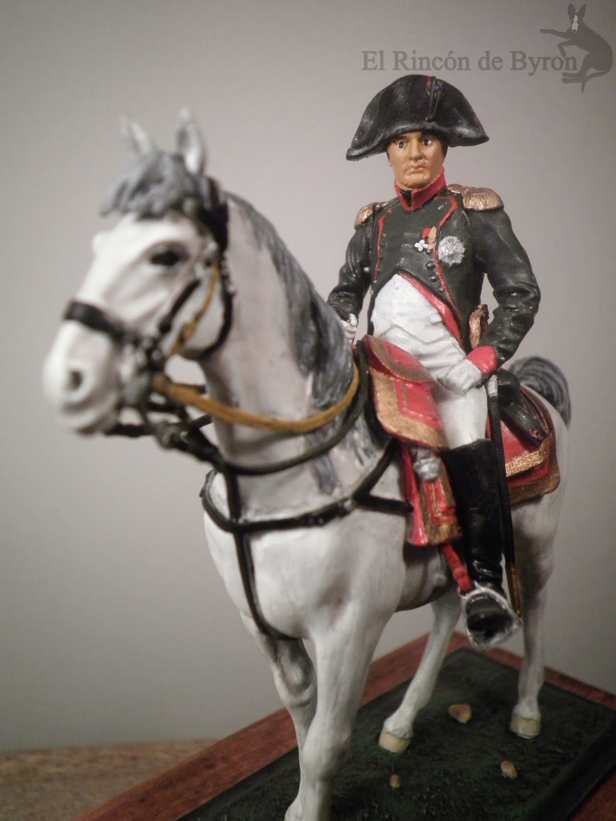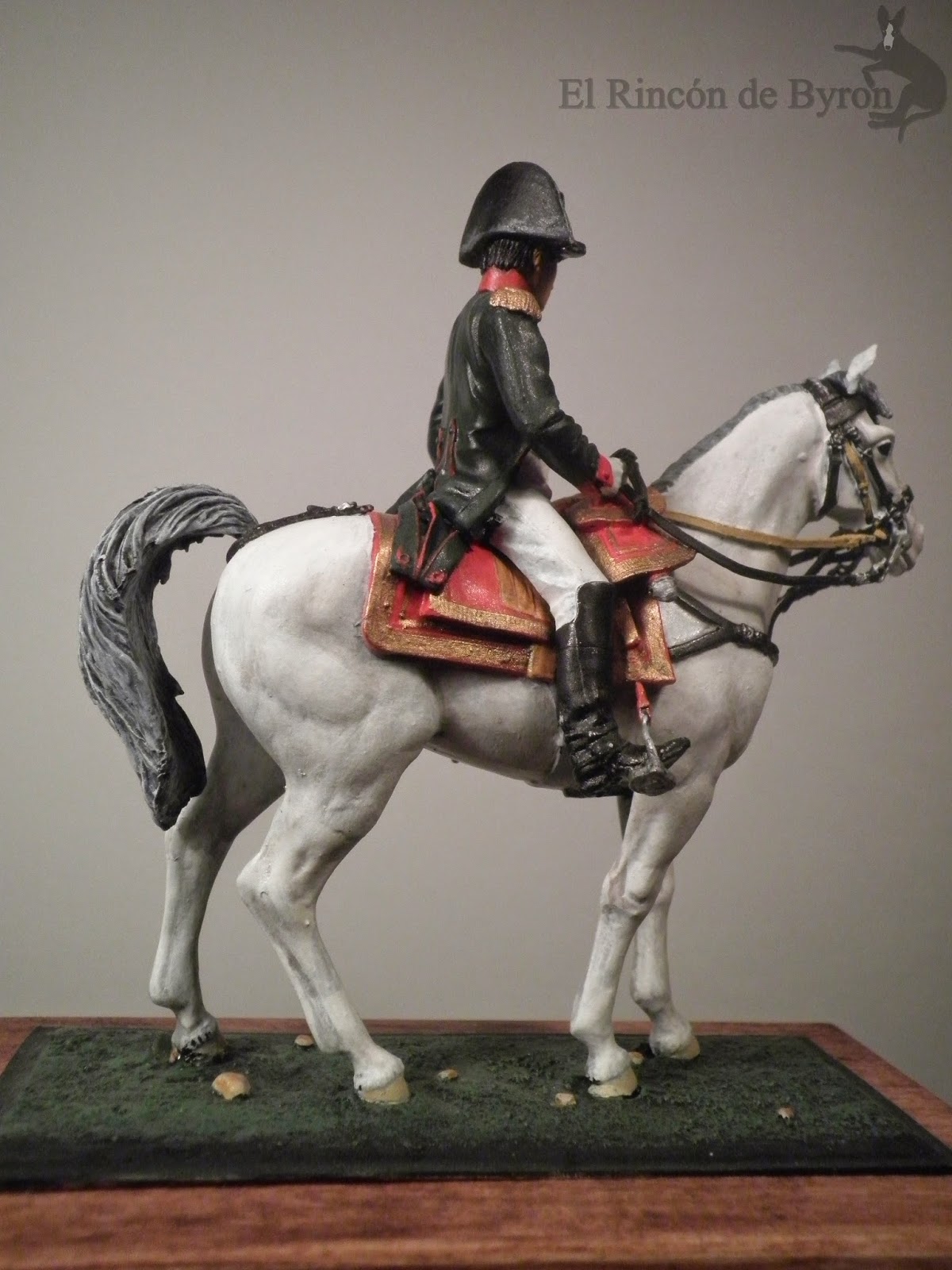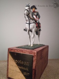 La figura en cuestión es \»Napoleon on Horseback, Friedland 1807\», de Andrea Miniatures, que podeis encontrar también en su página web. La figura viene desmontada por partes, pero en general encajan bien y con un buen pegamento o cianocrialato no tiene mayor complicación su montaje. Pintada con acrílicos de Vallejo y Citadel. Ahora quizás le pondría una base más vistosa, con un terreno más ondulado y hierba, que no la que venía por defecto con la figura. En otra ocasión.