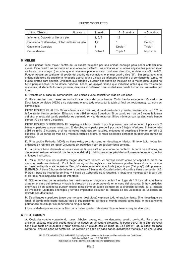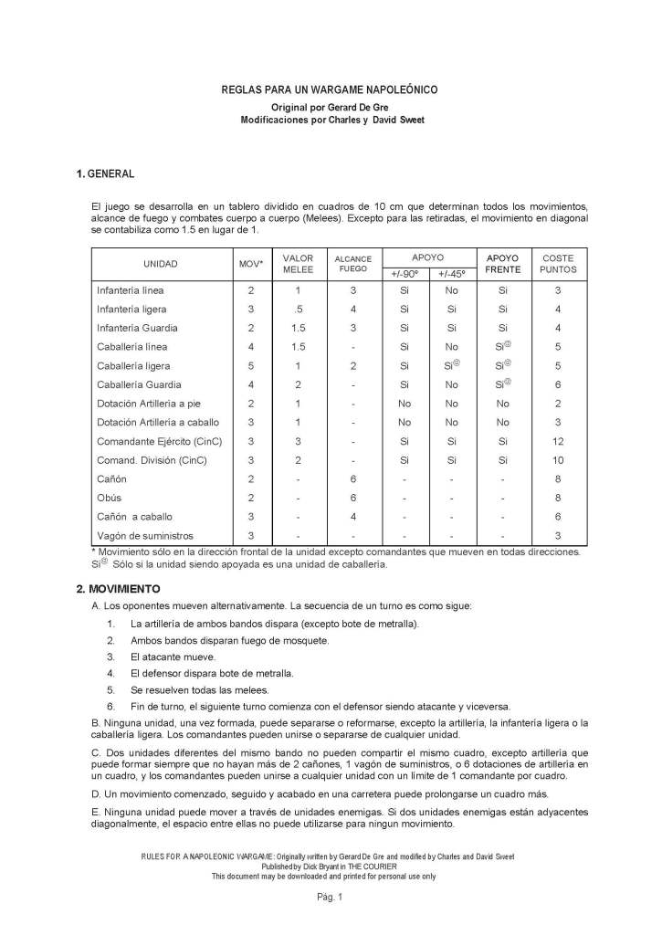 El reglamento descrito a continuación es una traducción del original «RULES FOR A NAPOLEONIC WARGAME», original de Gerard De Gre y modificado por Charles y David Sweet, que ha sido posible con la amable autorización de Robert Cordery.
