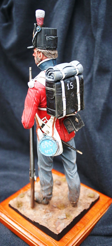7 – Mochila de lona pintada de negro que contenía todos los efectos y posesiones personales del soldado durante la campaña, que lleva la Estrella de la Jarretera (Star of the Garter) con las palabras Coldstream Guards en su centro. En la parte superior lleva un abrigo enrollado y una lata de porcelana blanca sujeta por correas de cuero.