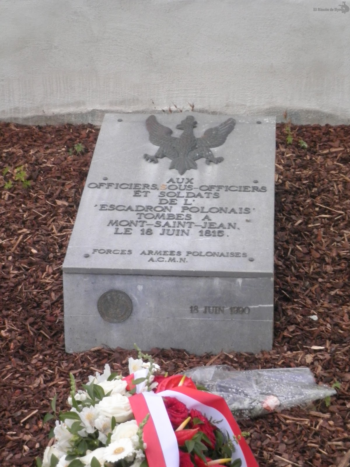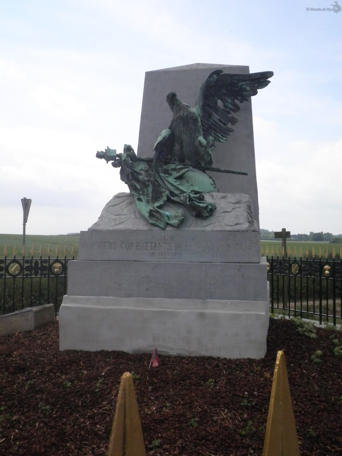 Por el camino, entre los múltiples monumentos de recordatorio diseminados por el campo, nos topamos con el erigido \»AUX DERNIERS COMBATTANTS DE LA GRANDE ARMEE, 18 JUIN 1815\», con el aguila derrotada y caída junto con una pequeña placa recordando a los soldados polacos luchando por el contingente francés.