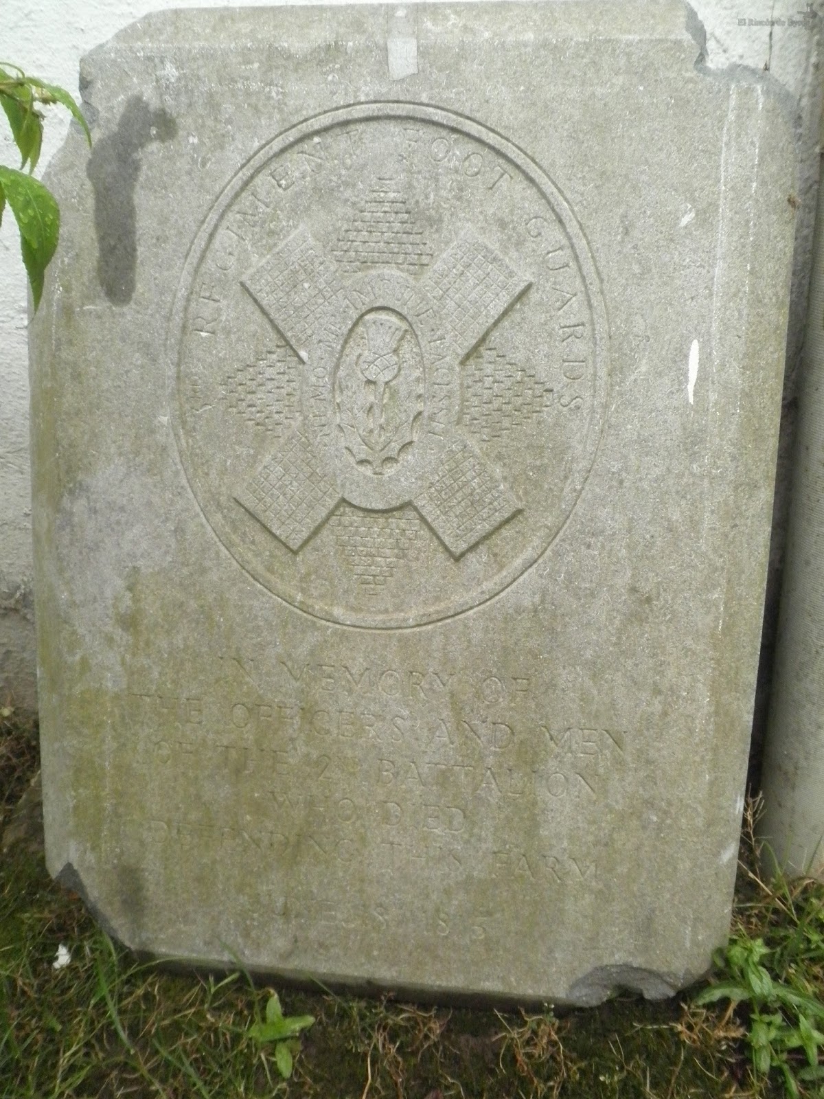 Placa conmemorativa dedicada a \»los oficiales y hombres del 2º batallón que murieron defendiendo esta granja, 18 de junio de 1815\» del 3er regimiento de los Guardias a pié |