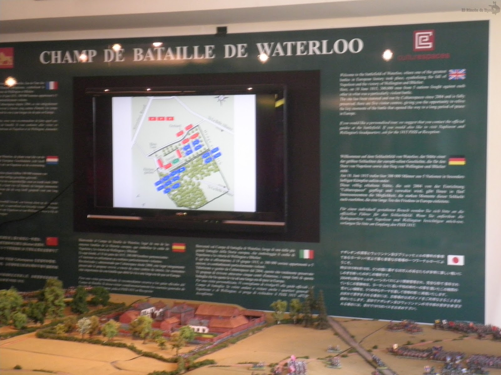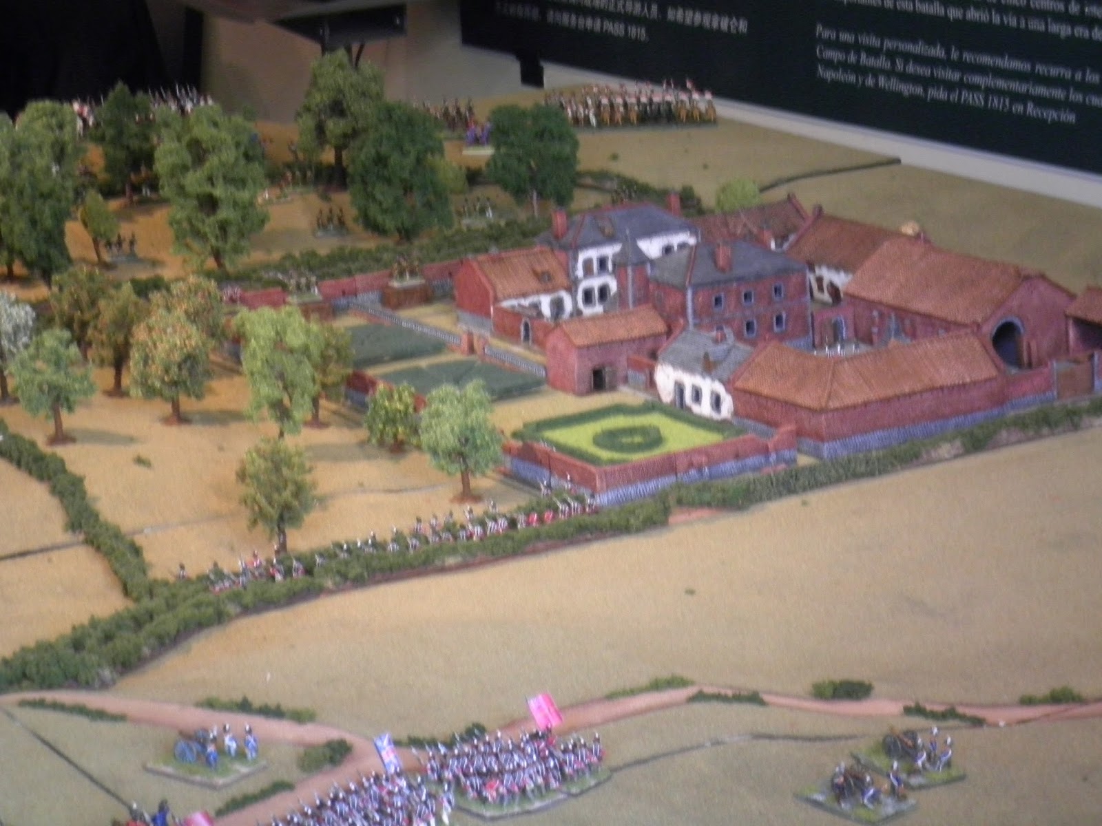 Una vez recorrido el museo subterráneo, se podía acceder a la panorámica de la batalla, de 360º pintada a principios del s.XX si no mal no recuerdo, que recoge entre otros el momento de la carga final de la caballería francesa sobre las tropas aliadas. A la entrada de dicha sala también se podía contemplar una maqueta de la granja de Goumont, o Hougoumont.