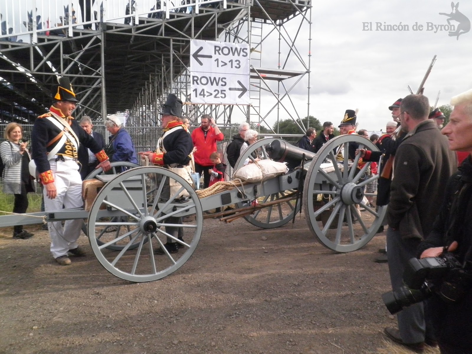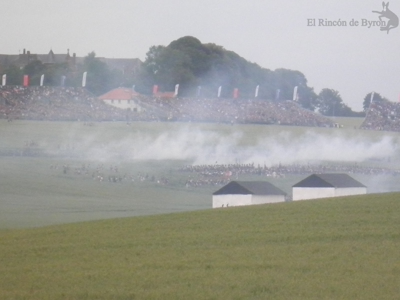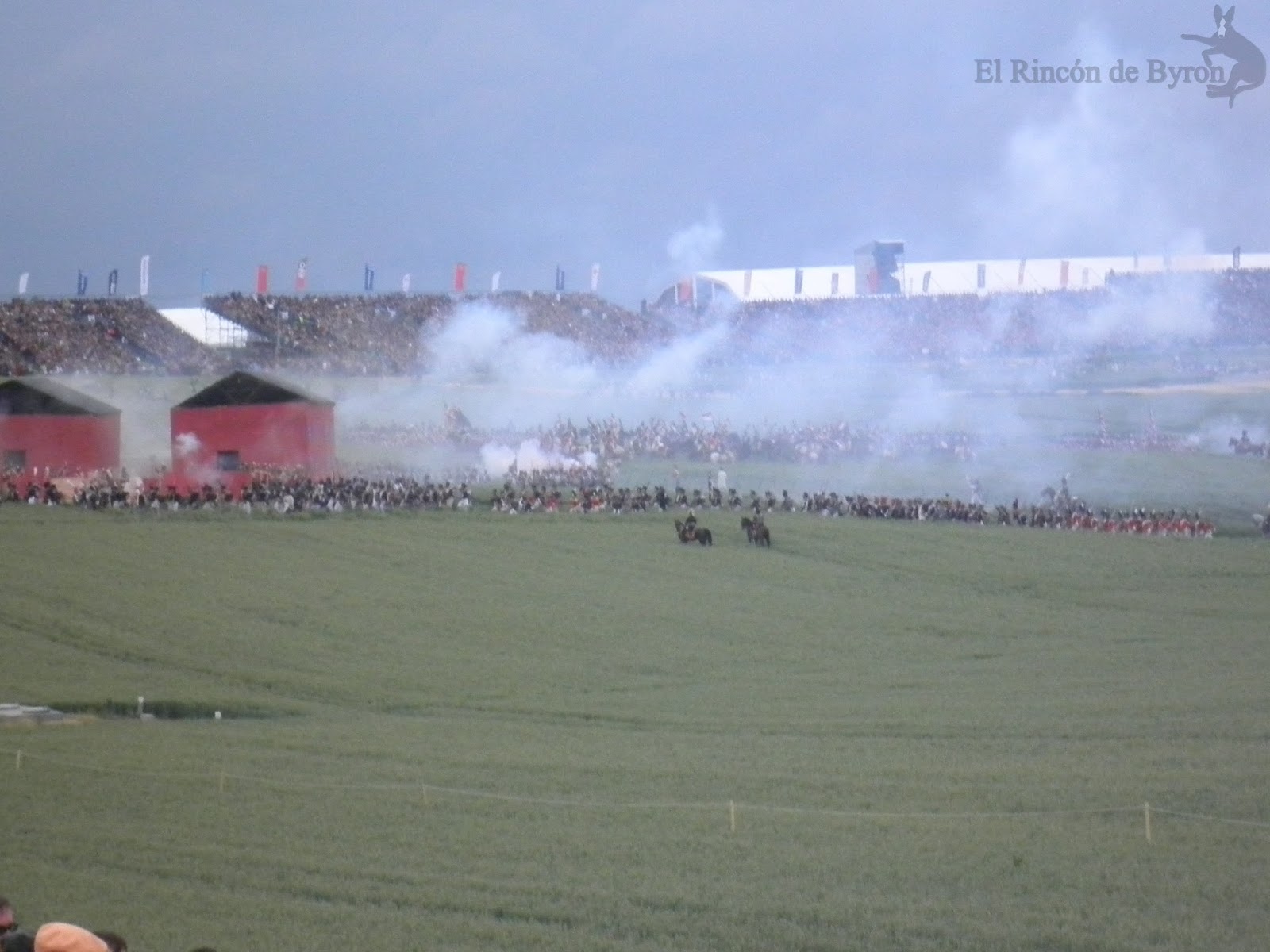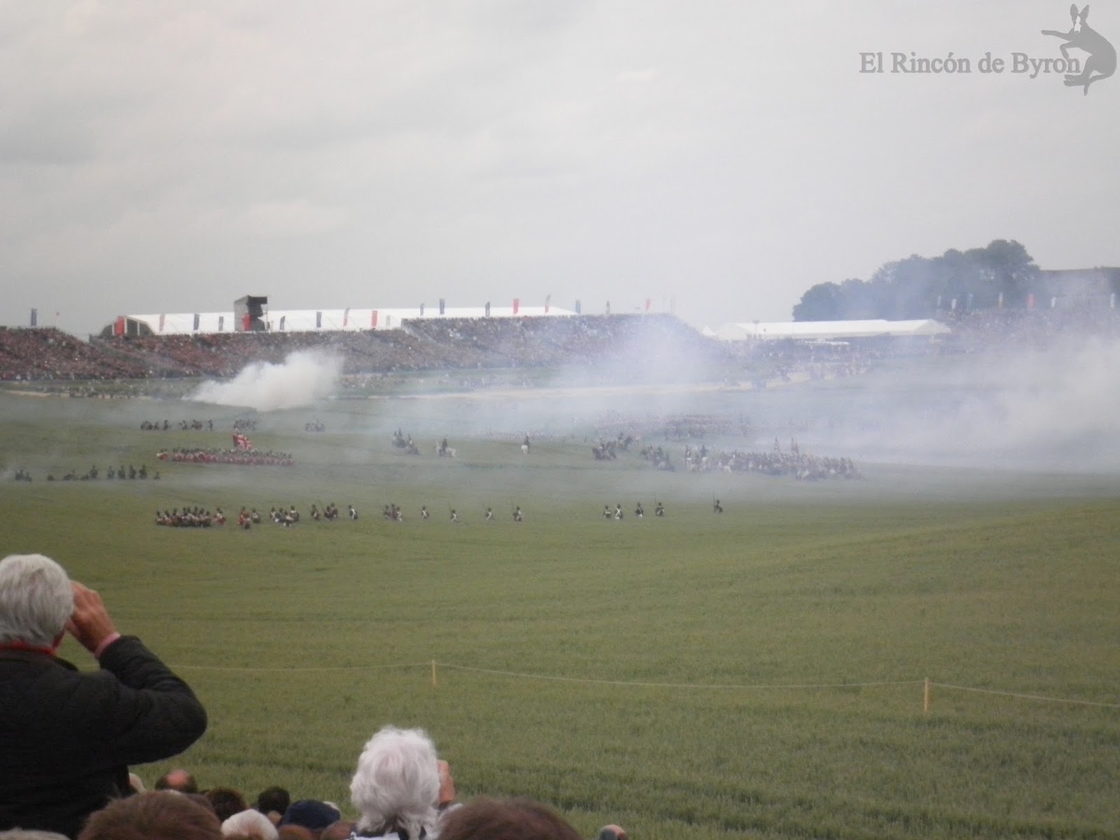 Como veis apenas he puesto texto porque he preferido que las fotos hablaran por si mismas. Sólo asistimos a la primera recreación, la del ataque francés, y fue el único gran lunar de nuestra visita a los campos de Waterloo. El haber reservado las entradas desde principios de año y en la parte alta de las localidades (por tanto sustancialmente más caras) no impidió que estuviéramos situados en el graderío N (muy lejos, vamos) y que apenas vislumbráramos la evolución de los figurantes y nos tuvimos que contentar con ver a distancia los respectivos cañoneos desde ambos lados. Por las fotos (algunas no son de mucha calidad, pero es que el zoom de la cámara no daba para más) y los videos ya os dareis perfecta cuenta de lo que comento.