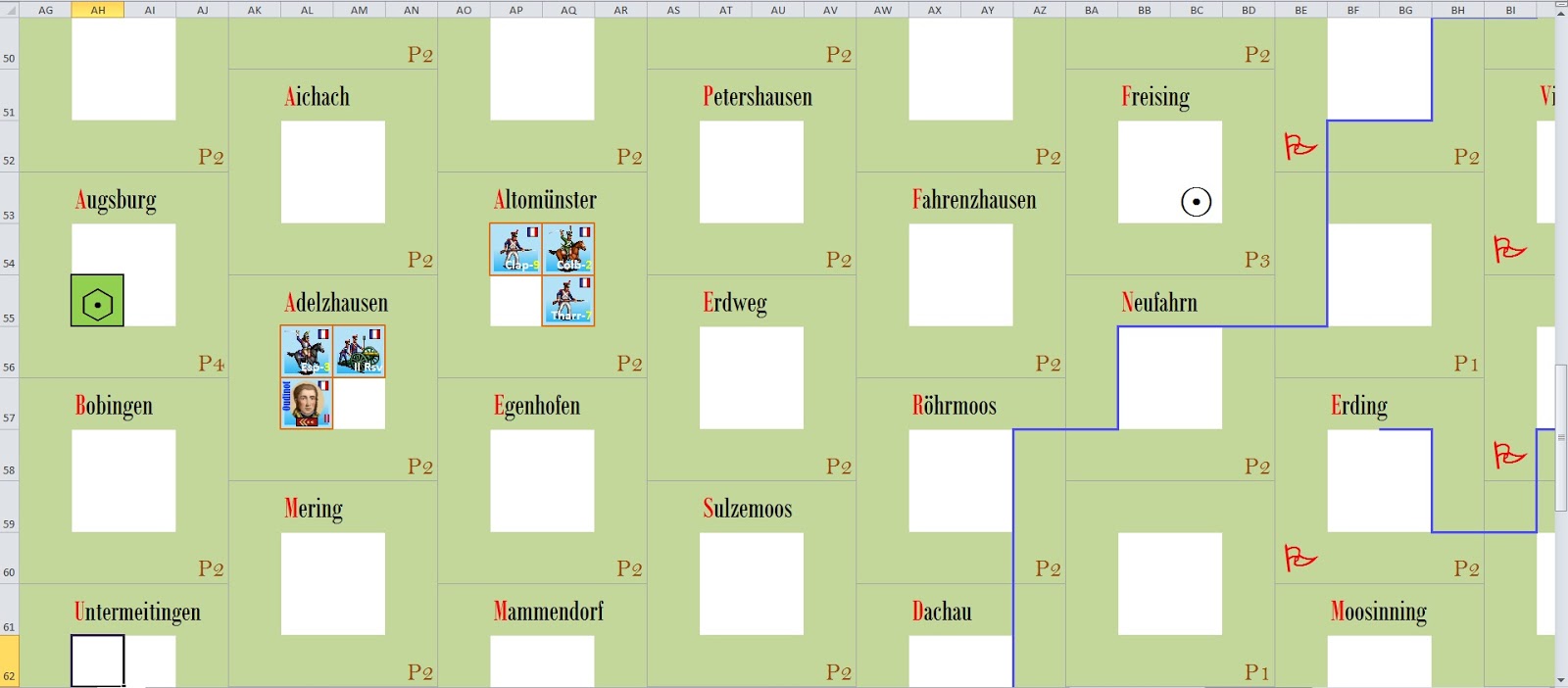The numbers are favorable to the Austrian Non Player, with 30,000 troops against near 20,000 french. A battle can occur in Wolnzach , with all Austrian troops (red arrows) or two twin battles (orange arrow) with the Austrian troops in Altenkirchen trying to neutralize the French troops in Reichertshausen and prevent they can\’t go to the aid of Oudinot. An interesting situation!