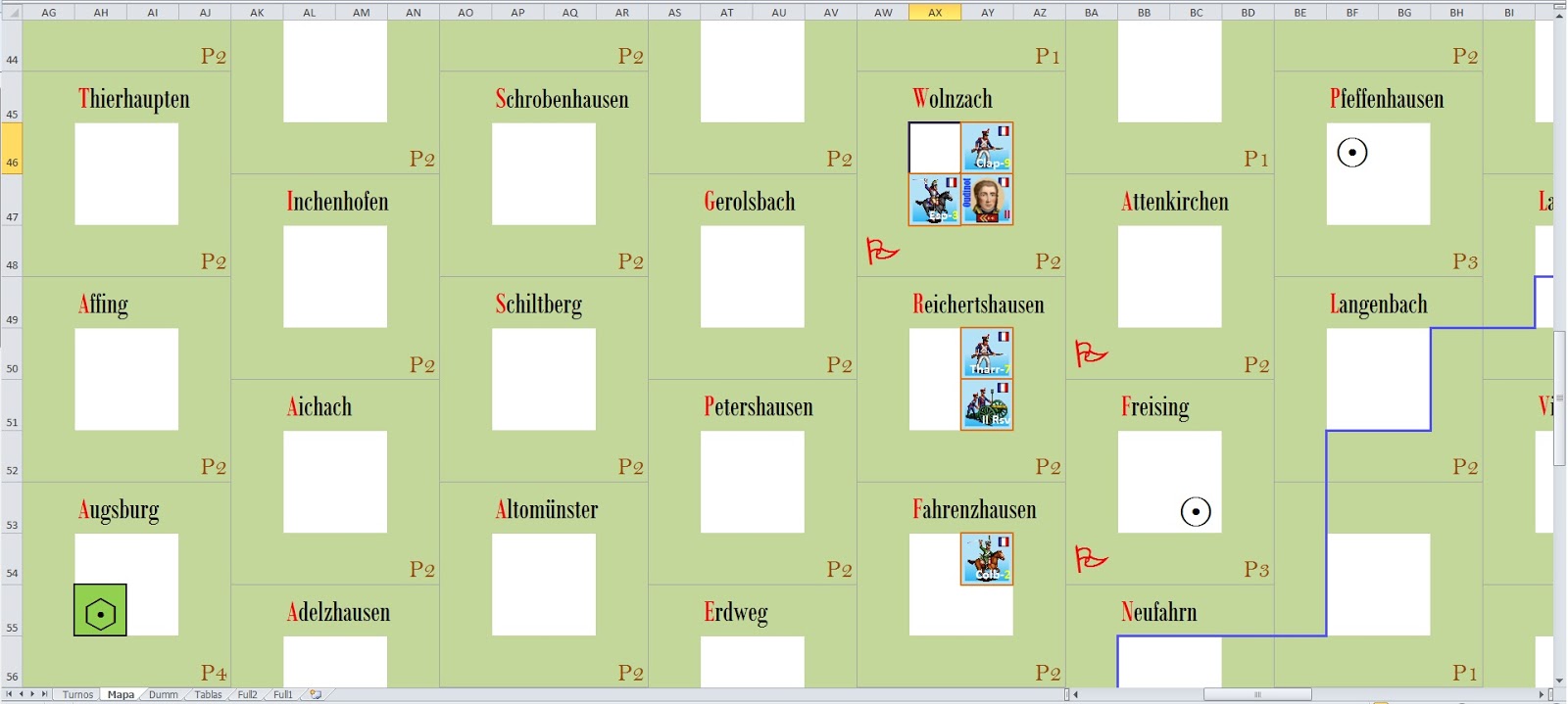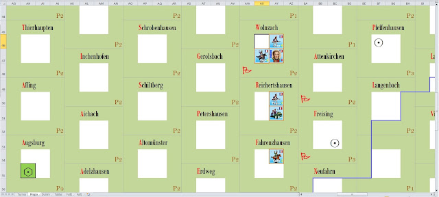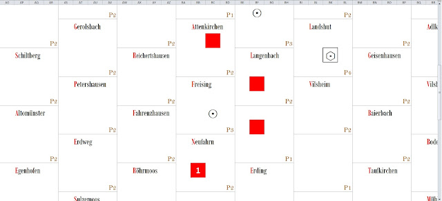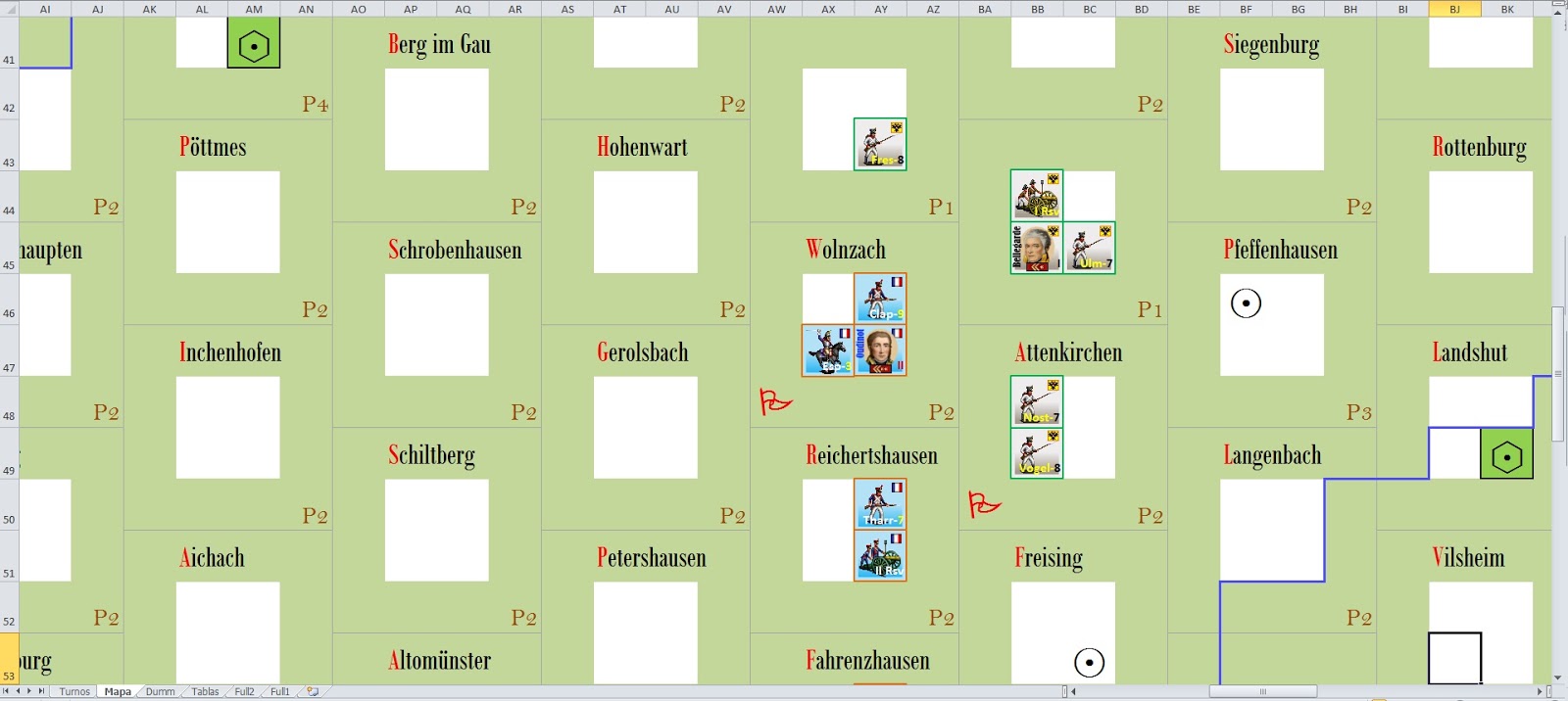 We try to block the line of dummies between Wolnzach and Fahrenzhausen. We check the red dummie in Wolnzach, a white square (vedette symbol, it could be another to the player\’s taste) and we confirm that it\’s a vedette of the enemy.