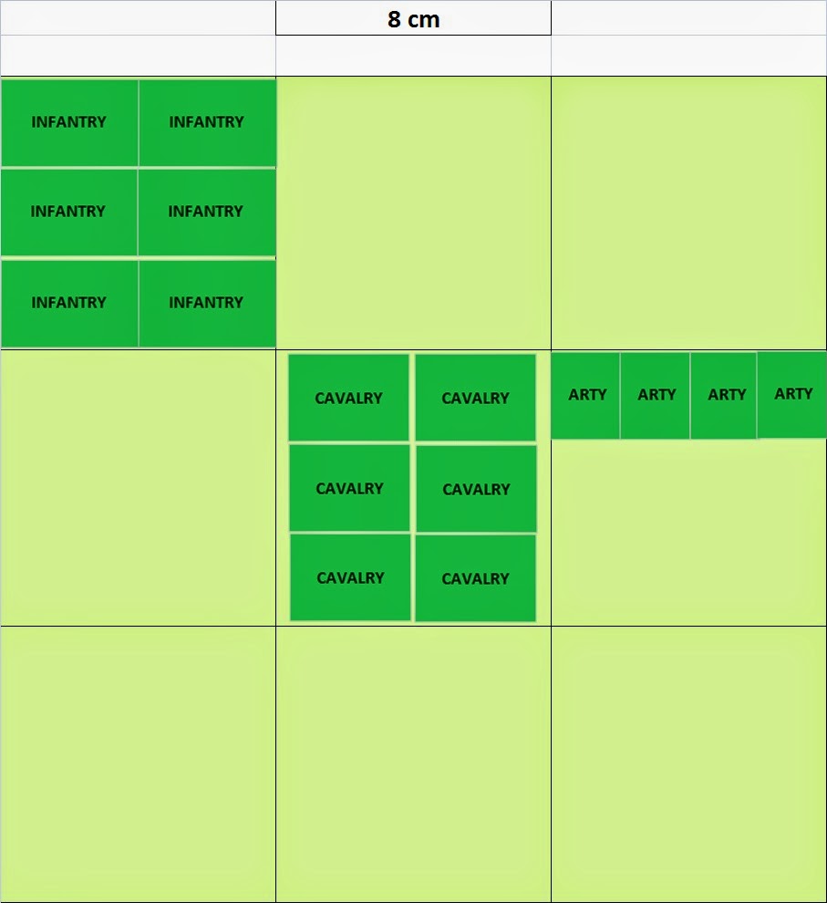 Pas de manoeuvre stands are 35×25 mm (1,37×0,98 inch) for cavalry units, 40x25 mm (1,57×0,98 inch) for infantry units and 20×25 mm (0,78×0,98 inch) for artillery units, but I\’m still doubting this last measure. The board square grid surely will be of 80×80 mm (3,14×3,14 inch) or 100×100 mm (3,93×3,93 inch) per square.