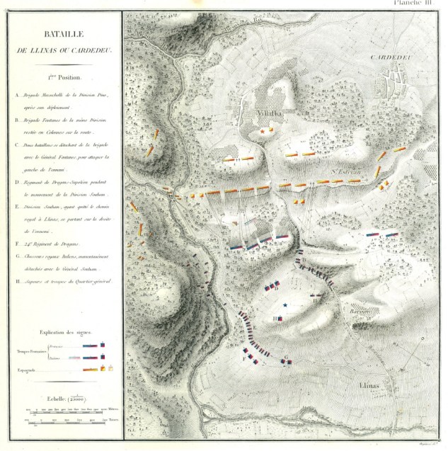 Ataque de la caballería española, ataque de la división italiana que bajo el fuego español se despliegan contra las órdenes de Saint-Cyr, el ataque en columna de la división francesa que contacta con las líneas españolas por el flanco sur i el ataque de la caballería francesa en diagonal contra la artillería española y el centro de la línea. También se refleja el ataque de unas compañías ligeras italianas que desbanda a los voluntarios catalanes por la zona de Alfou (Montseny).