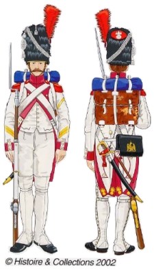 Tomado de Valmont, mismo gorro de piel de oso, misma casaca, pantalones y polainas, pero el uniforme es de color azul claro, en vísperas de la campaña de Rusia.