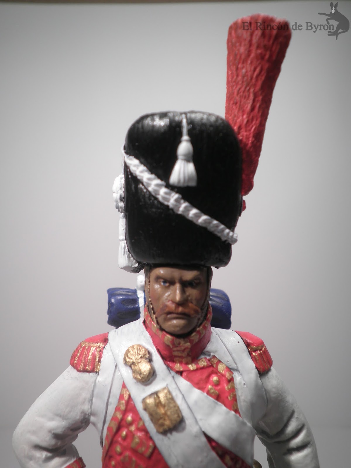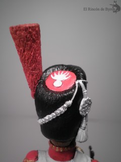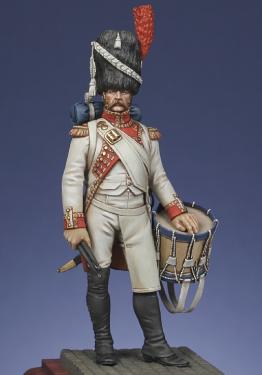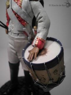 Mi figura por contra es de 120 mm, aprovechando partes de un kit de diferentes objetos de la casa Verlinden que incluía el tambor y el gorro de granadero. El cuerpo de la figura está modelado con masilla Das Pronto y las partes del cuello, delantal, correajes y arnés del tambor elaboradas con lámina de estaño. Pintado con acrílicos de Vallejo.