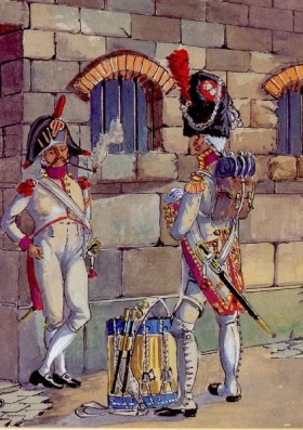 Tomado de Fallou, el mismo uniforme, pero las charreteras son similares a las de los granaderos de la Guardia antes de 1808, pero sin nidos de las golondrinas (estos fueron suprimidos a partir de ese año). Es decir, flecos de oro y carmesí, oro cruzando, cuernos escarlata con franjas de oro.
