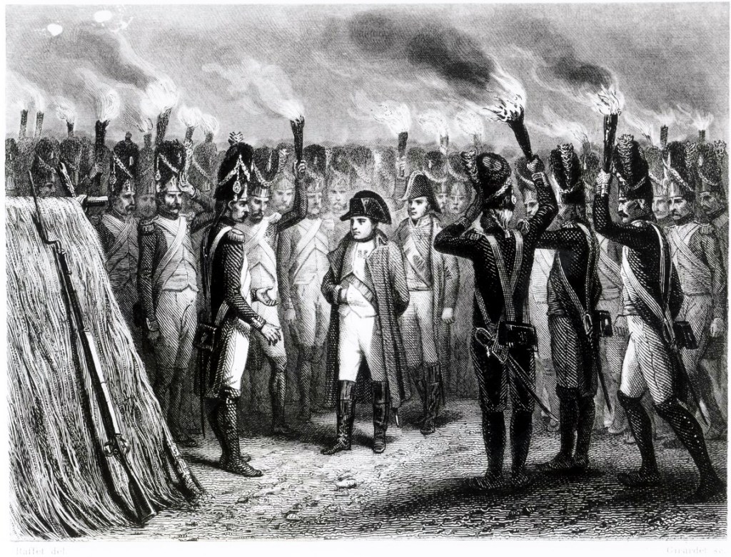 En esta Avenida de las luces, espontáneamente se oían los versos de la emblemática canción «Veillons au salut de l’Empire«, Napoleón vio a un viejo granadero que venía hacia él, quien le dijo en un tono de respeto – que no disminuía utilizando la forma de tu – que los soldados veteranos utilizaban para dirigirse a él: