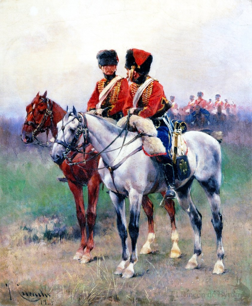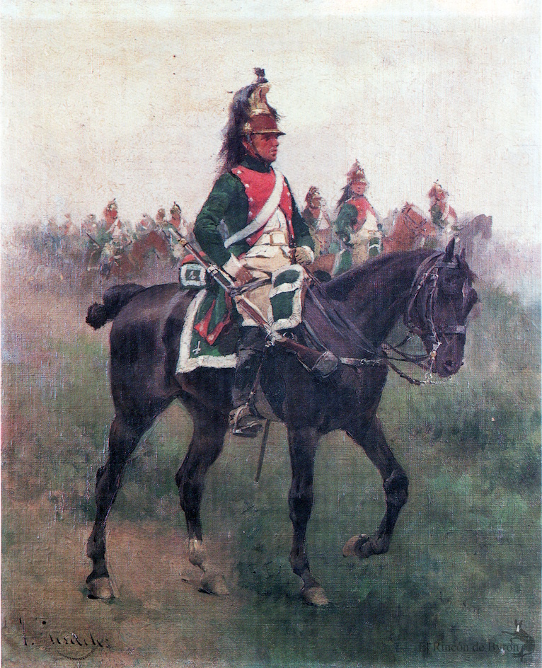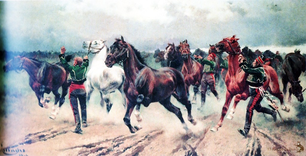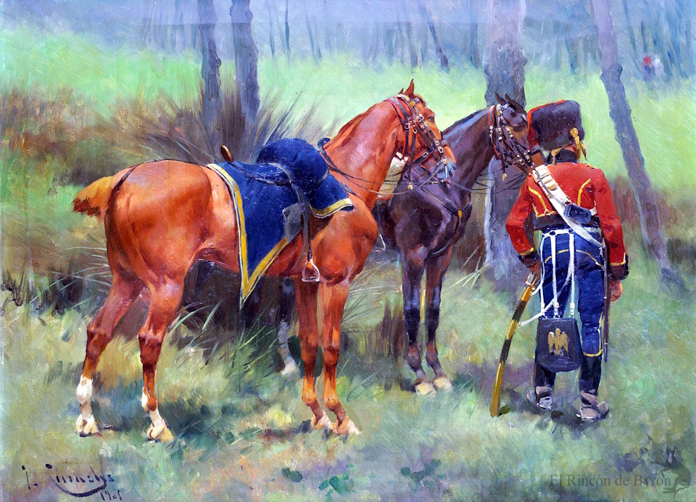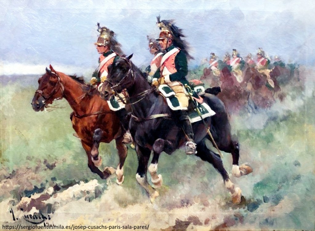 Lors d’une rétrospective organisée au Palacio de la Capitanía General de Barcelone, en 2011 je crois, sous le titre « Ferrer-Dalmau et l’héritage de Cusachs. Deux peintres catalans pour une armée », une série d’œuvres de Cusachs et de Ferrer-Dalmau a été exposée. Je ne suis pas un expert en peinture, ni même un amateur, mais j’aime les contempler, surtout lorsque le sujet est réaliste (comme c’est le cas ici) et qu’il reflète des épisodes de la vie militaire. Dans le cas de Cusachs, ses fonds flous typiques, mélancoliques selon les critiques, donnent une prétendue clarté et prépondérance aux figures centrales, militaires ou civiles ; dans le cas des thèmes consacrés aux cavaliers (mes préférés, soit dit en passant), tant sa série sur les manœuvres des différentes armes et les cavaliers traités de manière singulière que la perfection avec laquelle il les représente et surtout leurs montures, lui confèrent un cachet unique, à la hauteur des « monstres sacrés » tels que Detaille ou Meissonier.