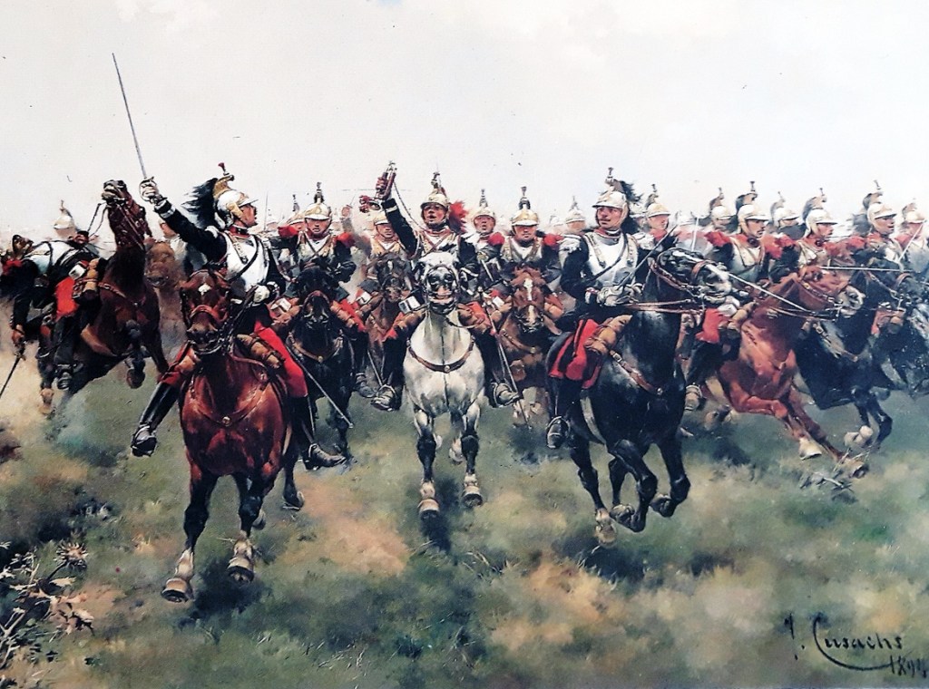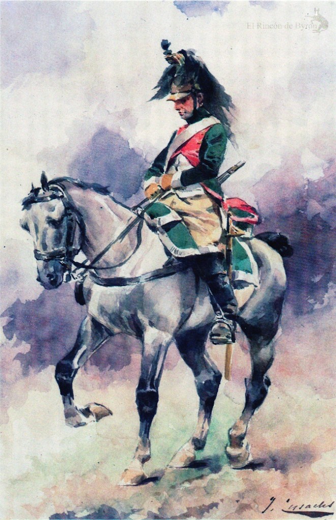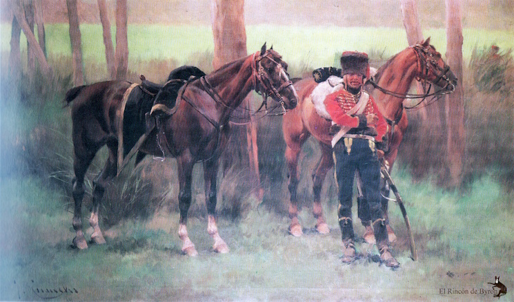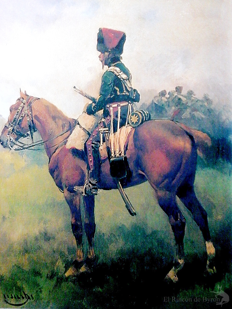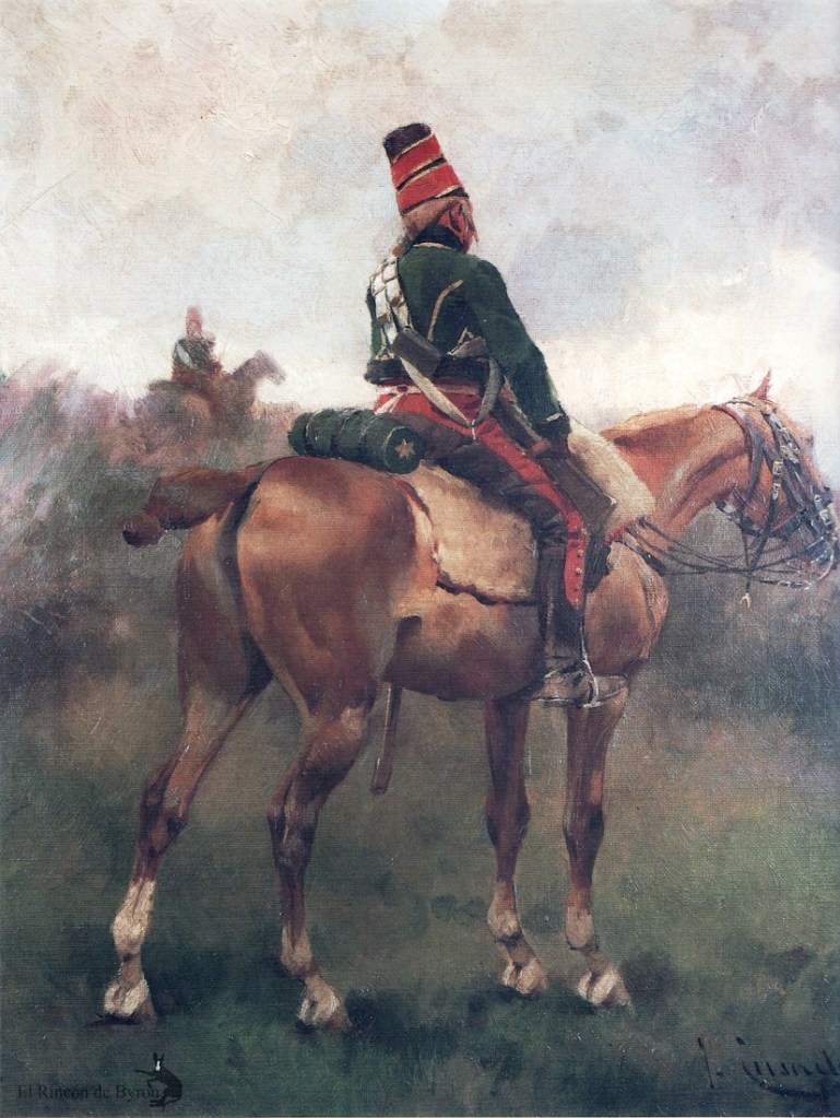 Lors d’une rétrospective organisée au Palacio de la Capitanía General de Barcelone, en 2011 je crois, sous le titre « Ferrer-Dalmau et l’héritage de Cusachs. Deux peintres catalans pour une armée », une série d’œuvres de Cusachs et de Ferrer-Dalmau a été exposée. Je ne suis pas un expert en peinture, ni même un amateur, mais j’aime les contempler, surtout lorsque le sujet est réaliste (comme c’est le cas ici) et qu’il reflète des épisodes de la vie militaire. Dans le cas de Cusachs, ses fonds flous typiques, mélancoliques selon les critiques, donnent une prétendue clarté et prépondérance aux figures centrales, militaires ou civiles ; dans le cas des thèmes consacrés aux cavaliers (mes préférés, soit dit en passant), tant sa série sur les manœuvres des différentes armes et les cavaliers traités de manière singulière que la perfection avec laquelle il les représente et surtout leurs montures, lui confèrent un cachet unique, à la hauteur des « monstres sacrés » tels que Detaille ou Meissonier.