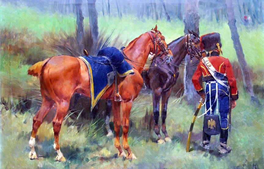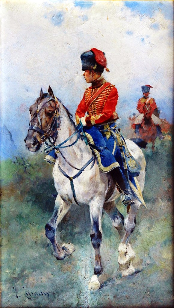 Durante una retrospectiva que se realizó en el Palacio de la Capitanía General en Barcelona, creo que en el año 2011, bajo el título «Ferrer-Dalmau y el legado de Cusachs. Dos pintores catalanes para un ejército«, se exhibieron una serie de obras tanto de Cusachs como de Ferrer-Dalmau. No soy ningún entendido en pintura ni tan solo aficionado, aunque me gusta contemplarlas sobretodo cuando la temática es realista (como es el caso) con el añadido de reflejar episodios de la vida militar. En el caso de Cusachs, sus típicos fondos desdibujados, melancólicos según los críticos, dan una pretendida claridad y preponderancia a las figuras centrales, militares o civiles; en el caso de los temas dedicados a soldados de caballería (mis preferidos, dicho sea de paso), tanto sus series sobre maniobras de las distintas armas como los jinetes tratados singularmente y la perfección con la que plasma a estos y sobretodo sus monturas, le confieren un sello único y rozando la altura de los «monstruos sagrados» como Detaille o Meissonier.