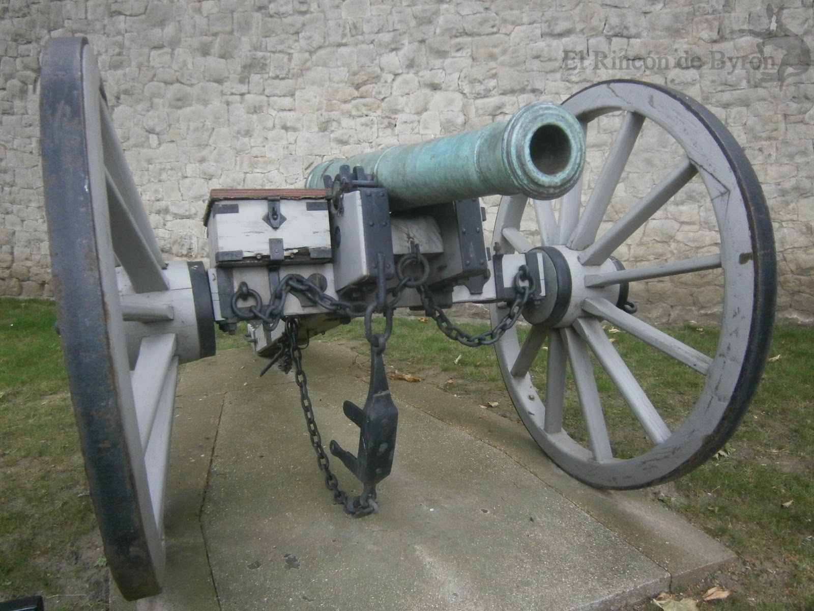 Modelo de cañón de 6 libras ubicado en la Torre de Londres, con el típico color gris en la cureña y ruedas. Para más información: