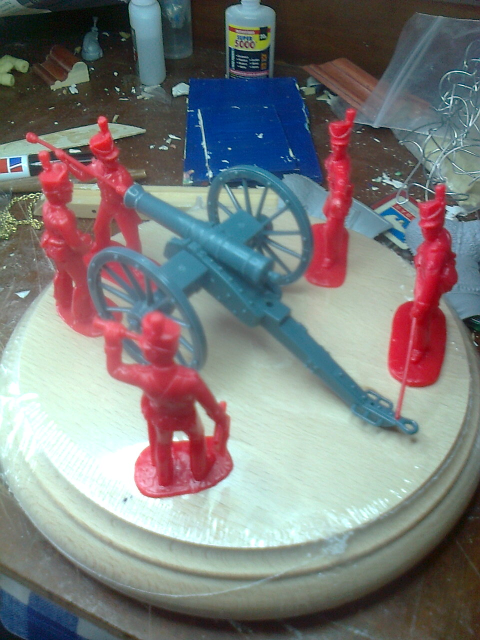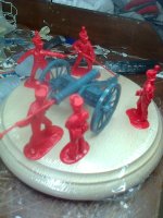 La referencia concreta es: Item #: 5431: Contents: 5 Man Crew in Red – 1 Cannon in Blue / Grey. El kit recién sacado de la caja, 5 figuras, el cañón (con dos versiones, según el calibre, escogí el más largo). La típica peana redonda, bastante justa para el conjunto, y que tampoco ofrece muchas variaciones si situamos el canón justo enmedio, con lo que toda la composición se centra en repartir las figuras por la peana con mayor o menor acierto.