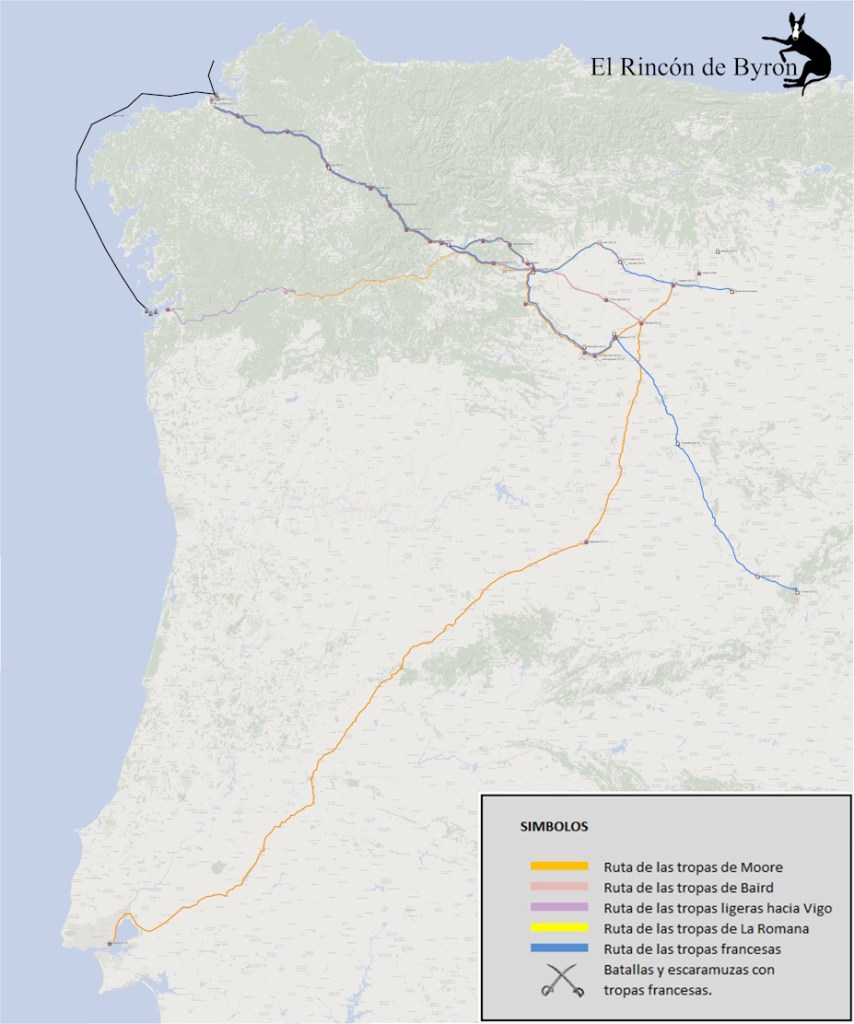 Hemos tratado de describir gráficamente la ruta seguida por Moore y su contingente con la ayuda de Google Maps, que podeis ver en el siguiente enlace: