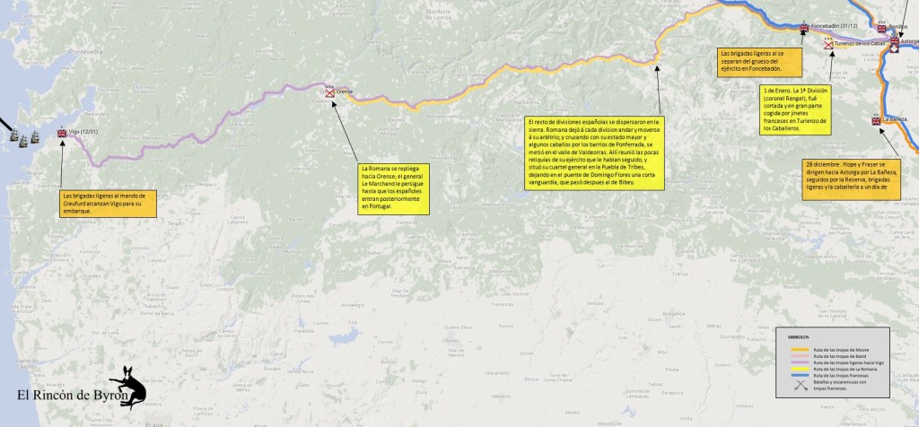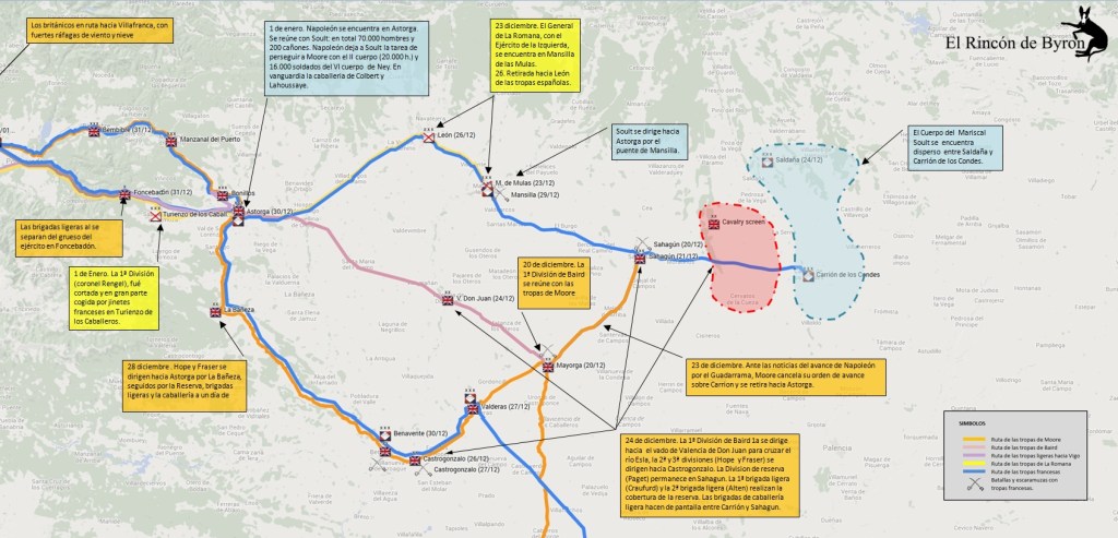– 28 diciembre – Las tropas se dirigen hacia Astorga por La Bañeza. Hope y Fraser primero, la división de reserva después y las brigadas ligeras y caballería a un día de distancia.