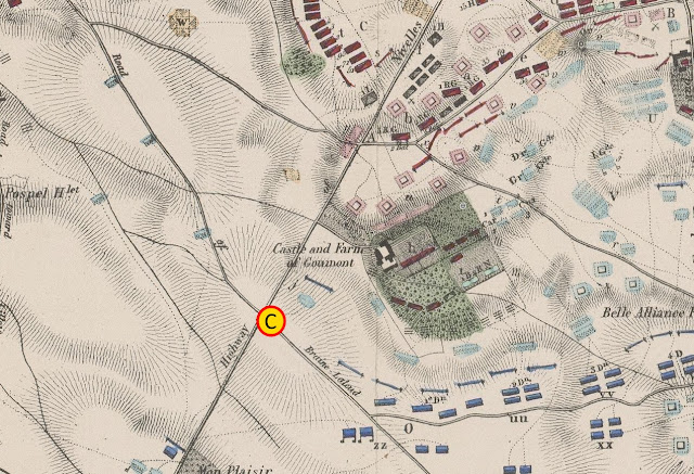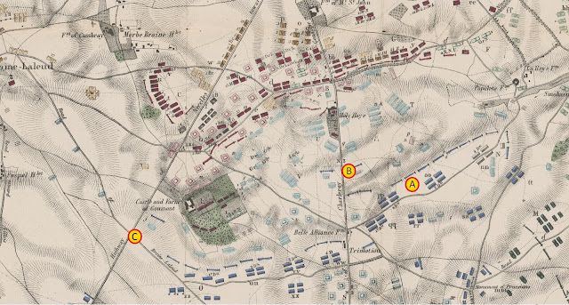 Leyendo la historia de Thiers, que se imagina que las tropas francesas parten de la primera llanura (A) para hacer frente a las crestas del camino de Ohain, tenían que descender a un pequeño valle y remontar un pendiente. Al menos eso es lo que este tipo de narrativa legendaria, que el tiempo contribuye a hacer pasar por creíble e incrustado en la memoria popular, tiende a hacernos creer. Pero esto es un gran error. Entre la llanura de La Belle Alliance y el camino de Ohain, el terreno afecta la misma forma que en la llanura de Mont-Saint-Jean, a saber ondulaciones y desniveles sucesivos del terreno. Las tropas de Erlon, las divisiones de Foy y Bachelu y toda la caballería francesa estaban situadas en una hondonada antes de una meseta y se quedan en un nueva hondonada que se encuentra en las laderas al pie de la carretera de Ohain. Esta segunda llanura, orientada al igual que la primera, es la de la de Belle-Alliance. Esta se acentúa especialmente a la izquierda de la carretera Bruselas y se redondea en forma de semicírculo. A partir de ahí se extiende hacia Goumont, el semicírculo dominando claramente La Haye Sainte, que se encuentra a unos 1.000 metros de la Belle-Alliance.