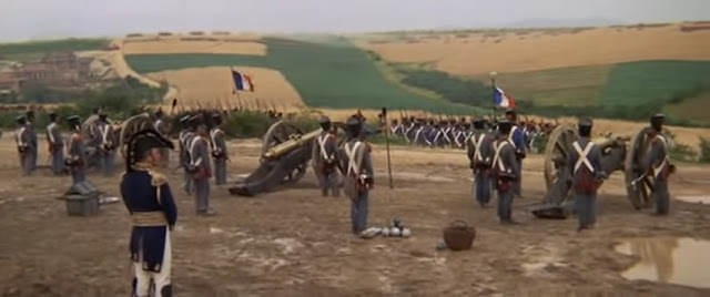 | Representación de las posiciones francesas y La Haye Sainte en el centro en el film Waterloo (1970). La gran Batería estaba situada más a la derecha. |