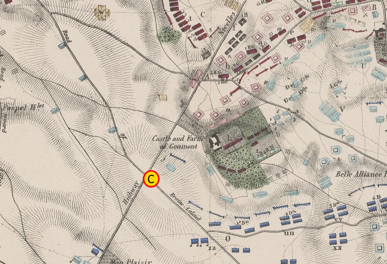 Leyendo la historia de Thiers, que se imagina que las tropas francesas parten de la primera llanura (A) para hacer frente a las crestas del camino de Ohain, tenían que descender a un pequeño valle y remontar un pendiente. Al menos eso es lo que este tipo de narrativa legendaria, que el tiempo contribuye a hacer pasar por creíble e incrustado en la memoria popular, tiende a hacernos creer. Pero esto es un gran error. Entre la llanura de La Belle Alliance y el camino de Ohain, el terreno afecta la misma forma que en la llanura de Mont-Saint-Jean, a saber ondulaciones y desniveles sucesivos del terreno. Las tropas de Erlon, las divisiones de Foy y Bachelu y toda la caballería francesa estaban situadas en una hondonada antes de una meseta y se quedan en un nueva hondonada que se encuentra en las laderas al pie de la carretera de Ohain. Esta segunda llanura, orientada al igual que la primera, es la de la de Belle-Alliance. Esta se acentúa especialmente a la izquierda de la carretera Bruselas y se redondea en forma de semicírculo. A partir de ahí se extiende hacia Goumont, el semicírculo dominando claramente La Haye Sainte, que se encuentra a unos 1.000 metros de la Belle-Alliance.
