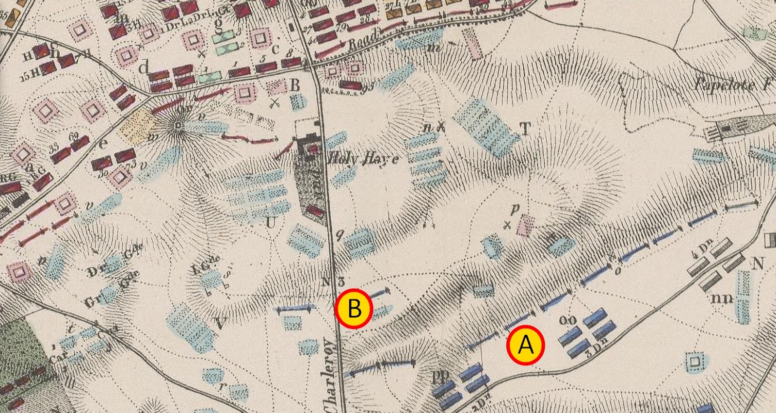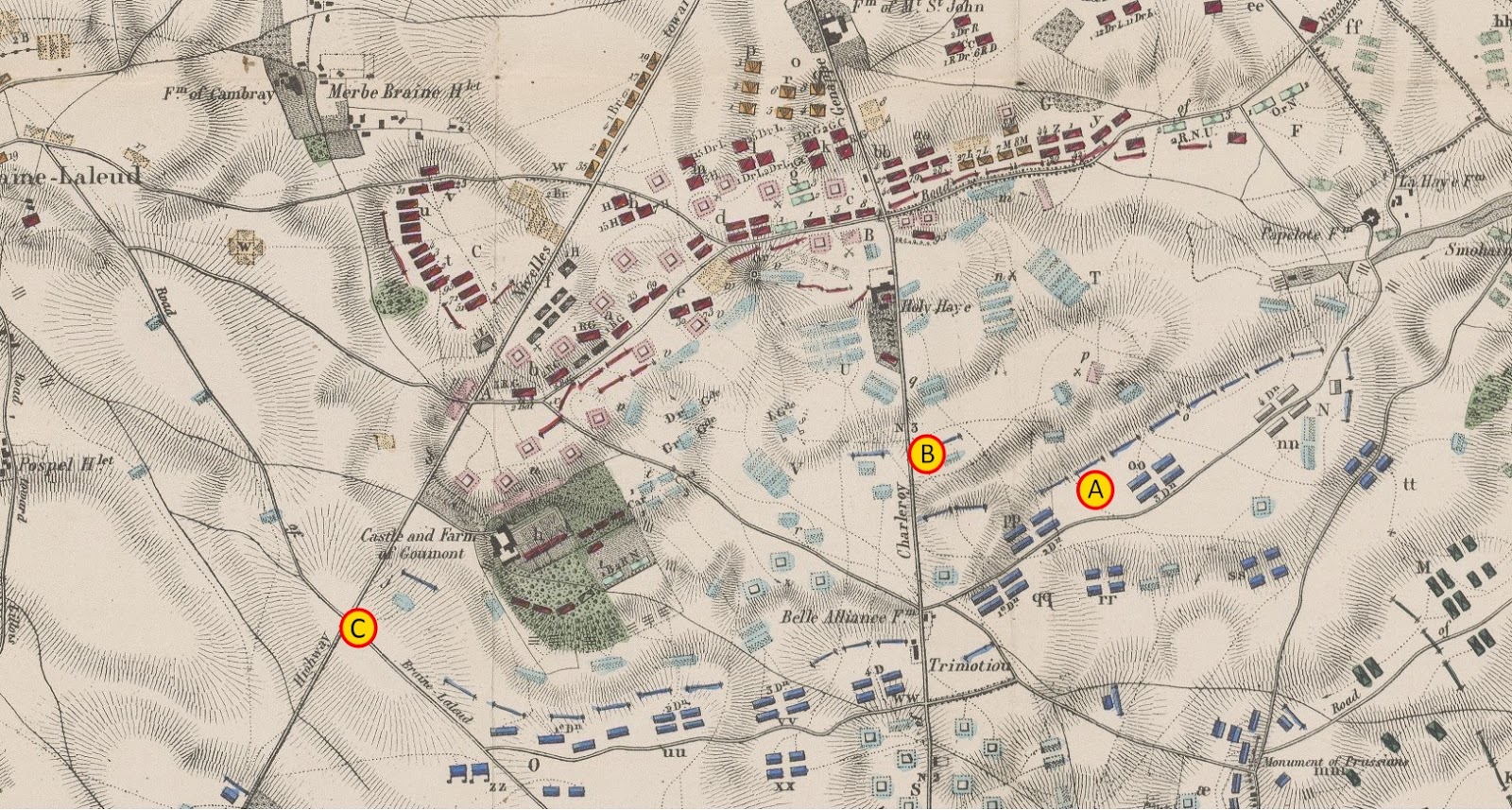 – La primera, como ya se encontraba, a la altura de la Belle Alliance (A), con el objetivo de forzar a la artillería de Wellington a retirarse.