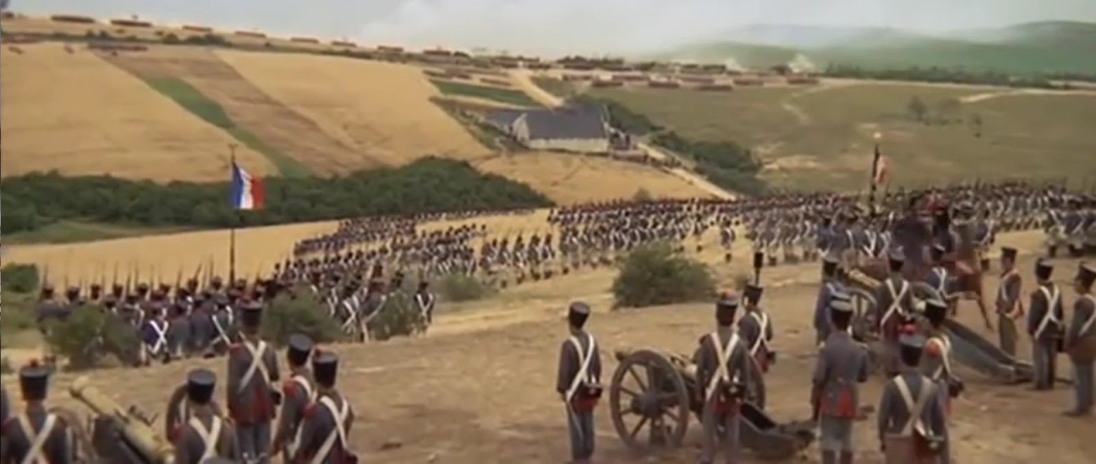 | Representación de las posiciones francesas y La Haye Sainte en el centro en el film Waterloo (1970). La gran Batería estaba situada más a la derecha. |