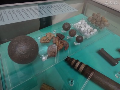 | Balas de plomo, balas \»shrapnel\», restos de obús y bala de cañón de 12 libras |