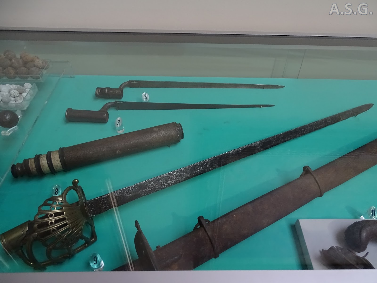 | Bayoneta francesa, bayoneta inglesa, catalejo y sable de oficial de caballería (tipo garde de bataille) y sable de dragón inglés. mod. 1796. |