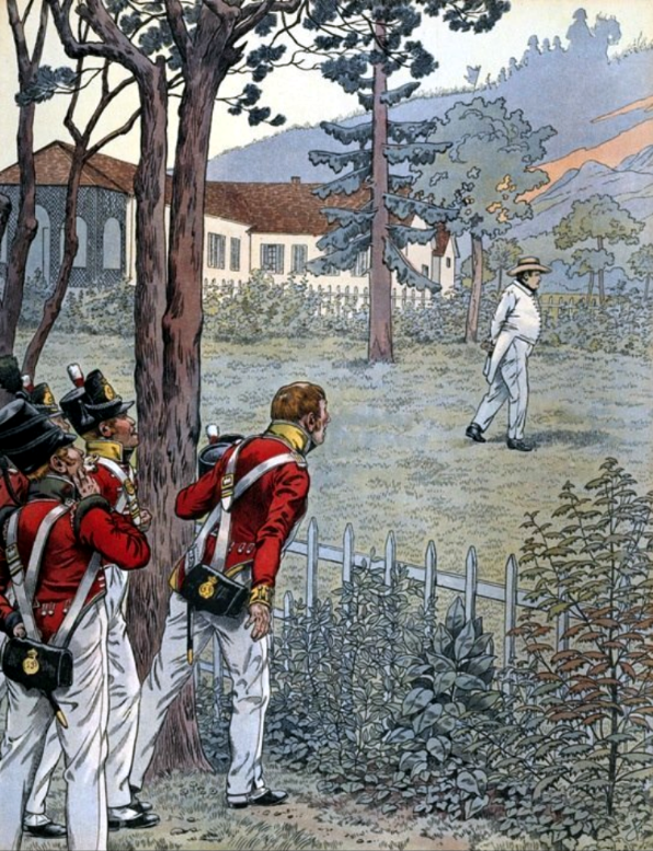 Napoleón comenzó a levantarse todas las mañanas a las cinco y media, se ponía una liviana camisa de algodón y pantalones, chinelas rojas y un sombrero de paja de ala ancha y arrojaba un terrón de tierra a la ventana de uno de sus valets. «¡Alí! ¡Alí! ¿Aún duermes?» Después, entonaba la primera línea de un aria muy conocida: «Dormirás mejor cuando regreses a casa.» Parpadeando, Alí abría la ventana. «Vamos, perezoso —decía Napoleón—. ¿No ves el sol?» Otras mañanas modificaba el ritual y entonaba con burlona solemnidad: «¡Alí! ¡Alí! ¡Oh! ¡Allah! Alborea el día».