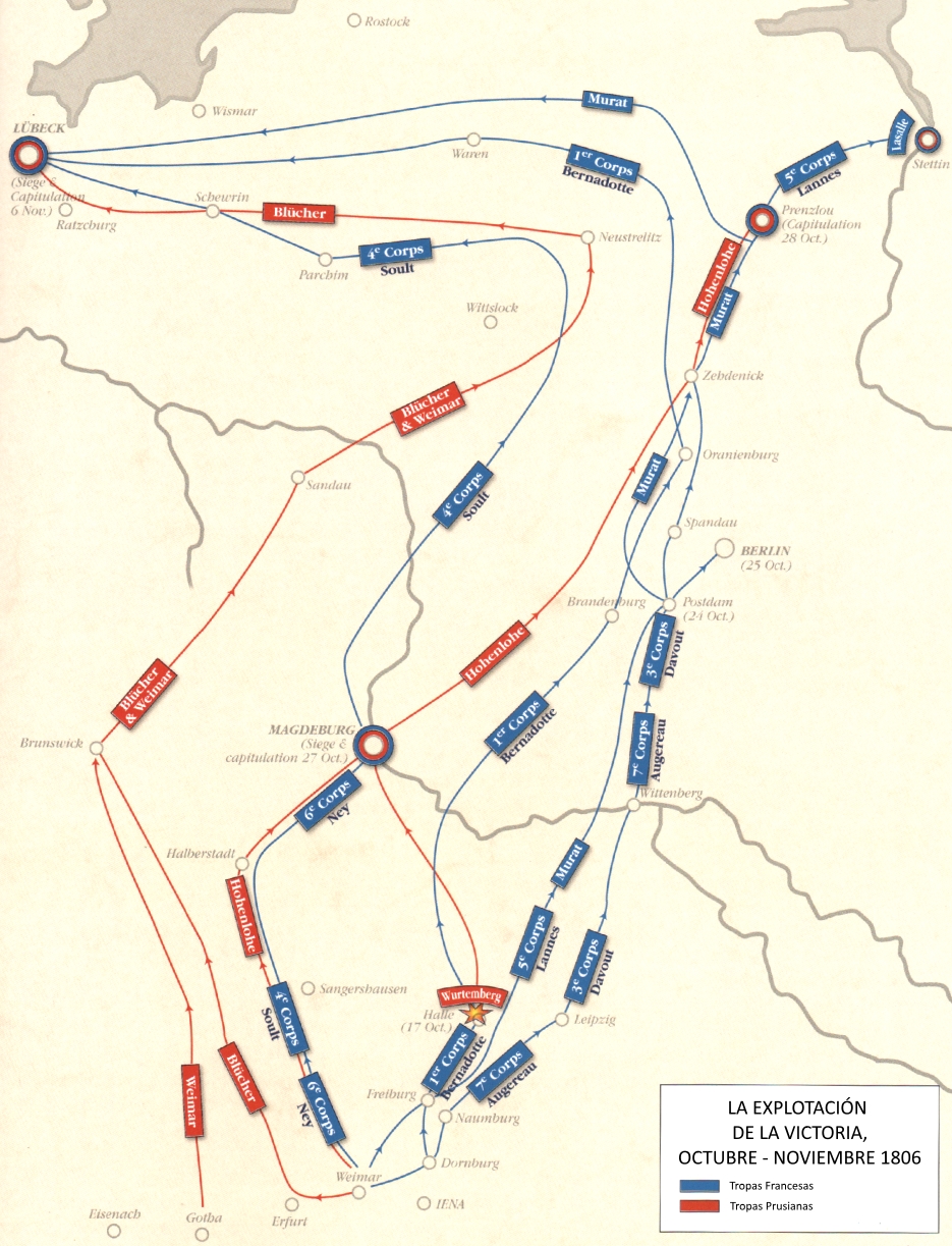 Después de Jena, se ordenó a Blücher tomar el mando del cuerpo del Príncipe de Wurtemberg y conducirlo a través del Oder; pero como consecuencia de la capitulación de Prenzlau y Pasewalk, no le quedó más ruta que dirigir su marcha hacia el bajo Elba, y uniéndose a los cuerpos de Weimar y Lecoq, al menos aliviar la presión sobre Magdeburgo, y sinó suponer una fuerza considerable para el enemigo en esa zona. Era la mejor opción, tanto para intentar dividir no sólo la atención del enemigo sinó también sus fuerzas. Pero la desequilibrante superiorida francesa y su inusual velocidad en los desplazamientos frustró los buenos efectos del plan y Blücher se vió en la necesidad de abrirse camino hacia Lübeck en vez de atravesar el Elba.