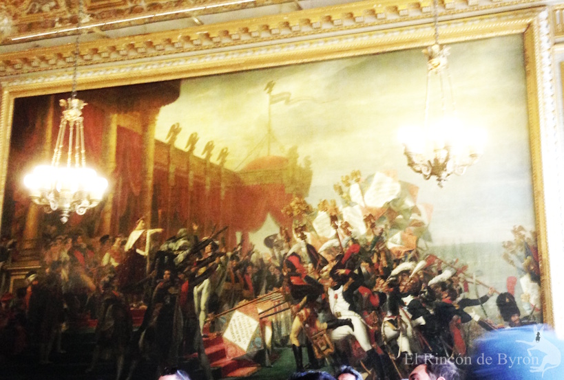 En el año 2015, coincidiendo con el bicentenario de Waterloo, pasamos unos dos o tres días en la famosa Ciudad de la Luz y aprovechamos para acercarnos a visitar el Palacio de Versalles, visita de la que os daremos cuenta en unas cinco entregas a partir de esta. En esta primera entrada de la serie, tratamos de las estampas de las guerras napoleónicas y de las guerras de la Revolución que tienen un lugar destacado en los muros de las salas del Palacio, no lejos del famoso Salón de los Espejos. Dicha serie de pinturas se encuentran básicamente en la Sala de la Coronación y en la Sala o Galería de las Batallas.