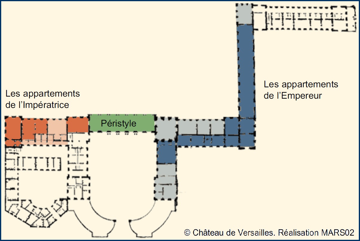 Bajo el Primer Imperio, se pidió a varios arquitectos que proyectaran la transformación de Versalles en la residencia de Napoleón. Al primero que se dirigió Napoleón fue Jacques Gondoin (1737-1818)(2), que hizo dos grandes proyectos, uno de los cuales dio lugar a la creación de numerosos planos y especificaciones. El reciente descubrimiento de éstas proporciona una oportunidad de tomar una nueva mirada sobre las propuestas del arquitecto. El análisis se centra en los apartamentos del emperador, que se llevaría a cabo en la planta baja. Como todos los proyectos de Versalles bajo el Imperio, los de Gondoin quedaron reflejados en papel siendo discutidos y consultados por otros arquitectos posteriores.