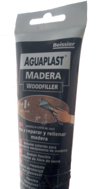 Queda un acabado basto pero ya lo lijaremos posteriormente, para uniformizar el acabado y adaptarlo a la curvatura del lomo. Llega el momento de rellenar las juntas entre las tiras de madera de balsa y los montantes laterales. Se puede hacer con cualquier producto de relleno tipo masilla, porque no son superficies grandes ni se van a ver a posteriori. Optamos por una masilla para rellenar madera de la marca Aguaplast que entre sus muchos productos comercializa esta para reparar o rellenar madera. El tono es en exceso rojizo, pero como irá pintado posteriormente tampoco nos importe en exceso. La verdad es que sólo queríamos rellenar las uniones y rendijas que quedaran, pero al final embadurnamos todo el interior, con el dedo mismo, ya que la escala no es muy grande y la masilla tiene un punto de pegajoso que tampoco facilita su trabajo.