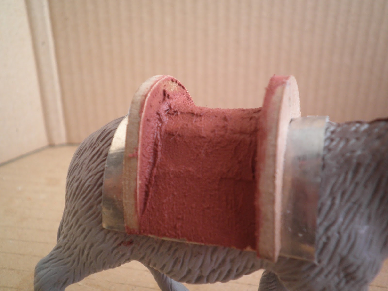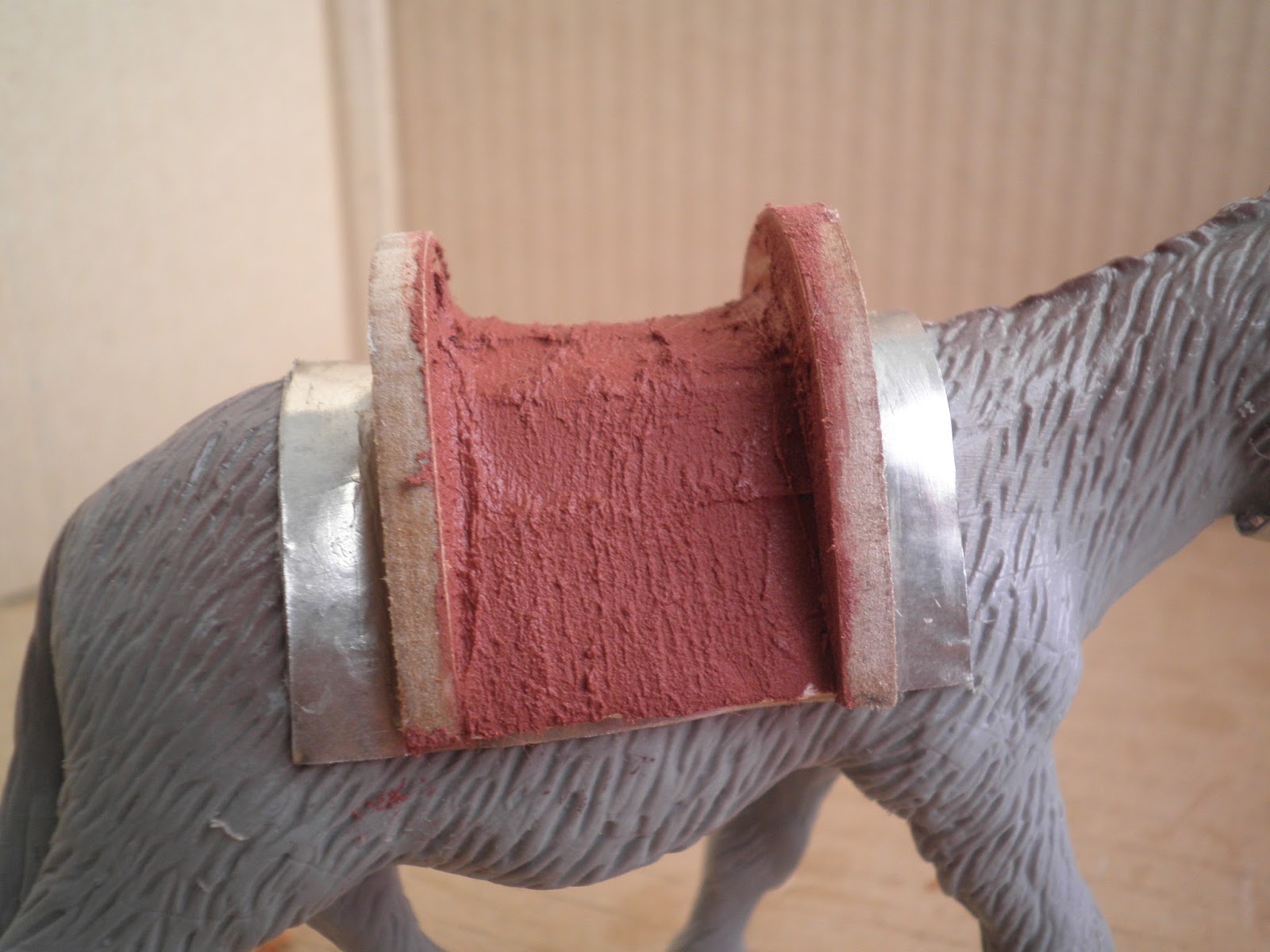 Una vez tenemos la figura, lo primero ha sido realizar la estructura de madera que va en el lugar de la silla de montar y que sirve para aguantar la carga de los distintos enseres. No he encontrado ninguna ilustración o foto que permitiera saber su forma, por lo que a partir de algunos dibujos encontrados en la red, sobretodo de la casa Historex, hemos improvisado una posible solución. Haciendo una plantilla con la forma del lomo de la figura, hacemos dos figuras en forma de \»U\» invertida con madera DM de 3 mm. y luego lijamos la rebabas o asperezas que haya dejado el corte. En la parte inferior de la \»U\» realizamos un agujero para poder pasar la cuerda de amarre, con una broca de las más pequeñas o con una punta de Dremel para hacer agujeros. Para nosotros ha sido suficiente uno de esos pequeños berbiquís de modelismo con brocas intercambiables, que hacen poco más de 1 mm de diámetro.