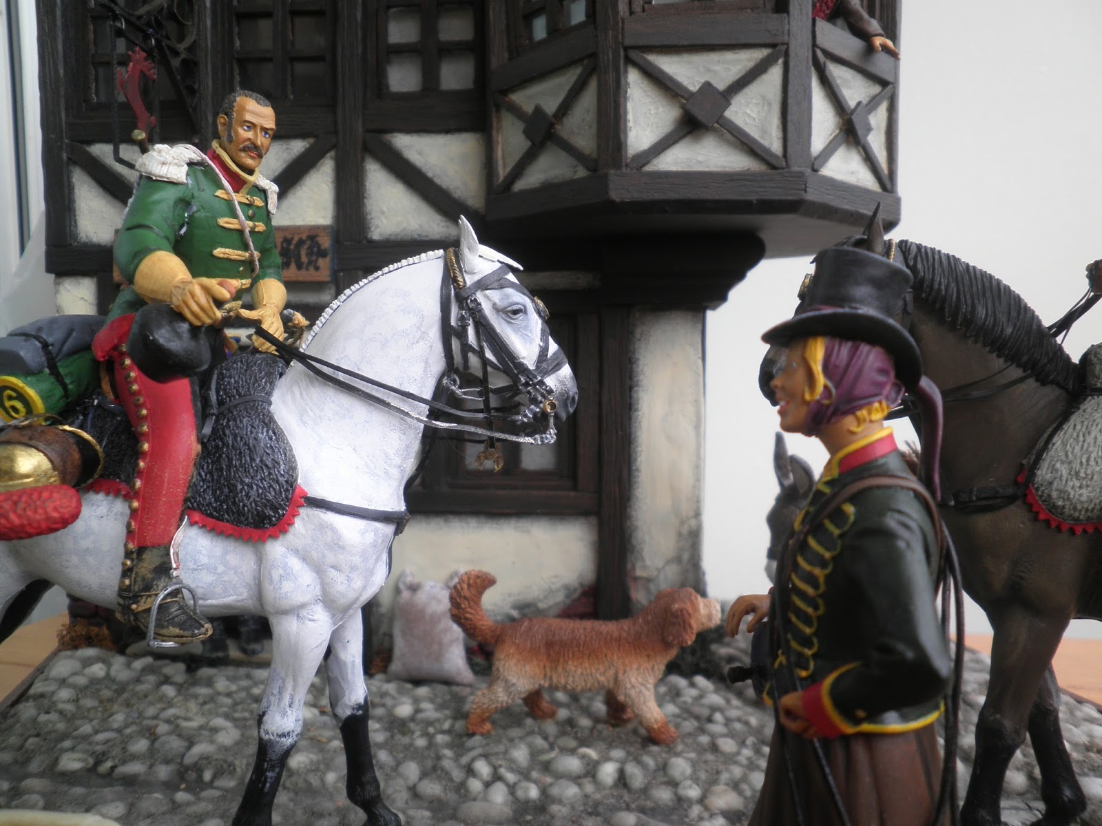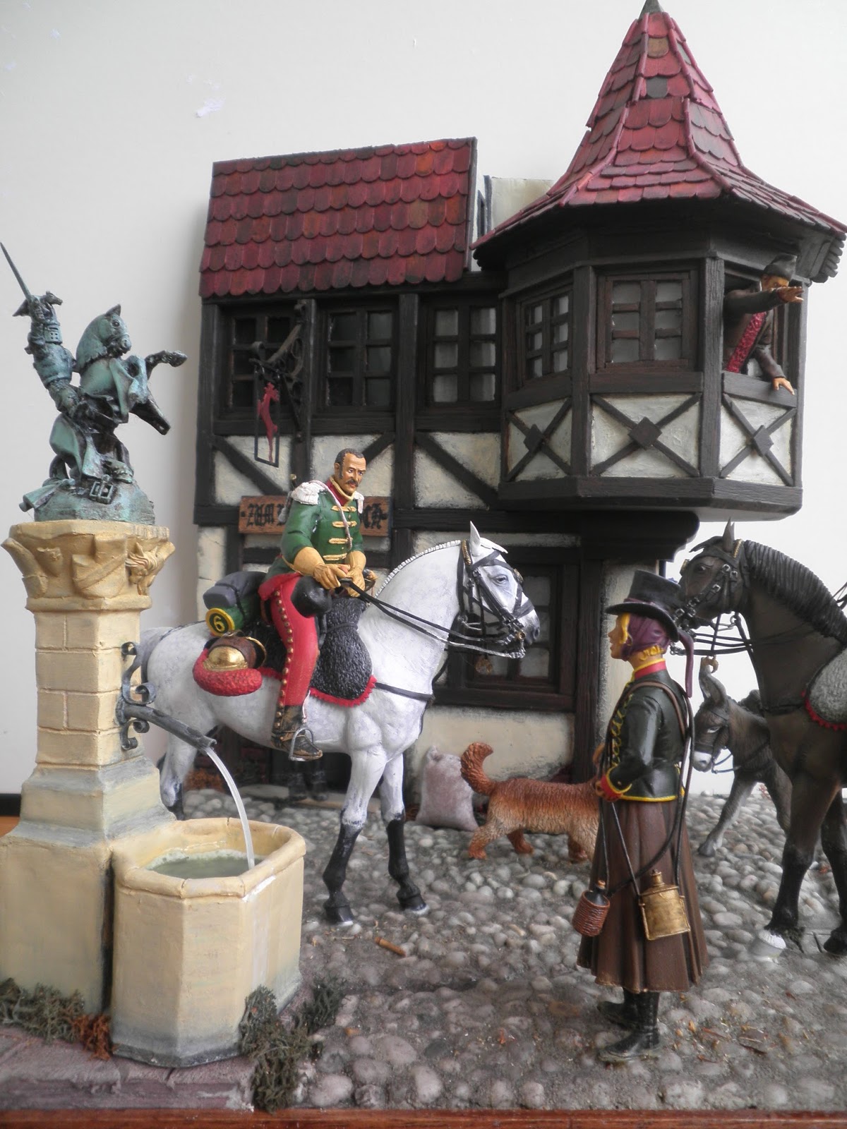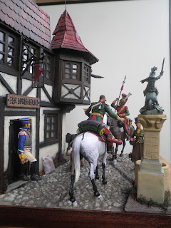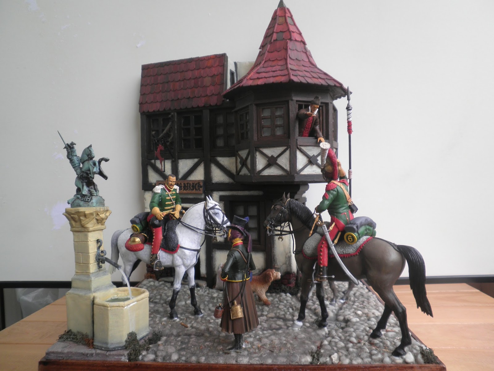 Como ya mencionamos en nuestra primera entrada esta es la escena acabada de los dos lanceros del 6º regimiento en un pueblo o pequeña ciudad cualquiera de la Alemania (o Prusia, según se quiera) ocupada del año 1813, el año de la Liberación por las tropas prusianas (y rusas, austríacas, suecas, etc.) de los territorios ocupados por los franceses en dichas tierras.