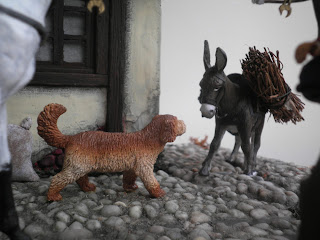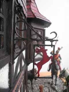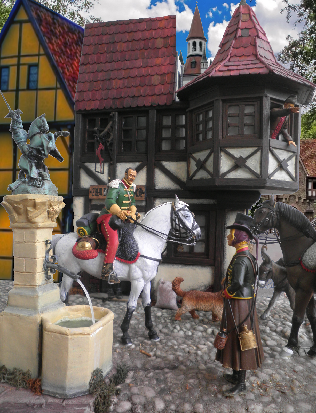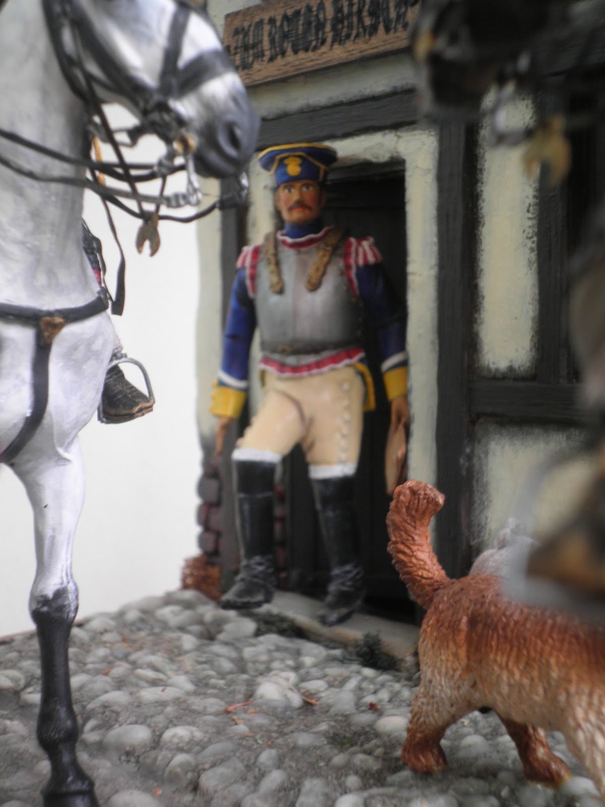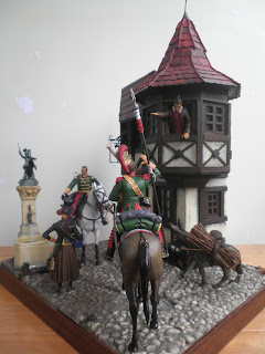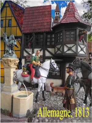 Como ya mencionamos en nuestra primera entrada esta es la escena acabada de los dos lanceros del 6º regimiento en un pueblo o pequeña ciudad cualquiera de la Alemania (o Prusia, según se quiera) ocupada del año 1813, el año de la Liberación por las tropas prusianas (y rusas, austríacas, suecas, etc.) de los territorios ocupados por los franceses en dichas tierras.