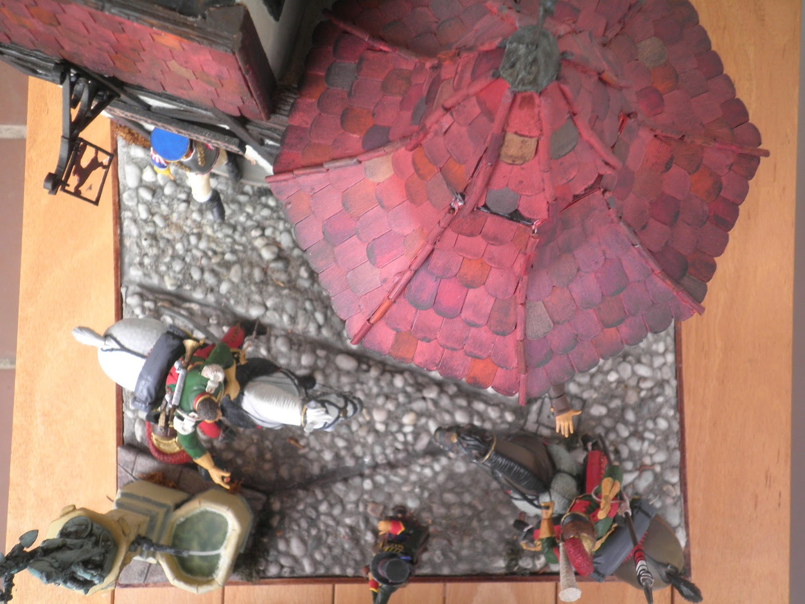 Esta escena es la primera y me temo, probablemente, que será la última que recreo, al menos en esta escala de 120 mm y con este tamaño que, como ya comenté en su momento se utiliza más como la típica figura o par de figuras figuras montadas en una peana o base, debido a su gran tamaño. Era una especie de reto personal, ya que nunca me había dedicado a hacer este tipo de viñetas o dioramas y el proceso empezó hace ya unos meses, en septiembre de 1915, confeccionando la caja de la base hasta prácticamente el día de ayer. Lógicamente no ha sido todo el tiempo empeñado en fabricarla, pero considero que el tiempo dedicado también ha sido bien empleado, ya que ha sido una experiencia trabajar con diferentes materiales y técnicas que espero que me sirvan en el futuro, eso sí, a una escala más \»normal\», como 1:32 o 1:35, o más pequeña, como 1:72. El gran problema, una vez más, ha sido el tamaño, la base tiene unos 35×30 cm y una altura de 36 cm, lo que ha llevado a tener que seccionar la torre de la glorieta, que ya se ve un poco desencajada en las fotos. Con todo creo que el resultado es aceptable, siempre dentro del nivel \»amateur\» -de estar por casa- en que se mueve uno.