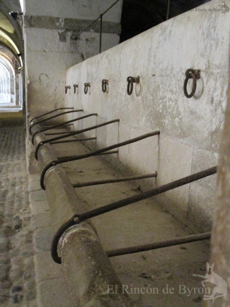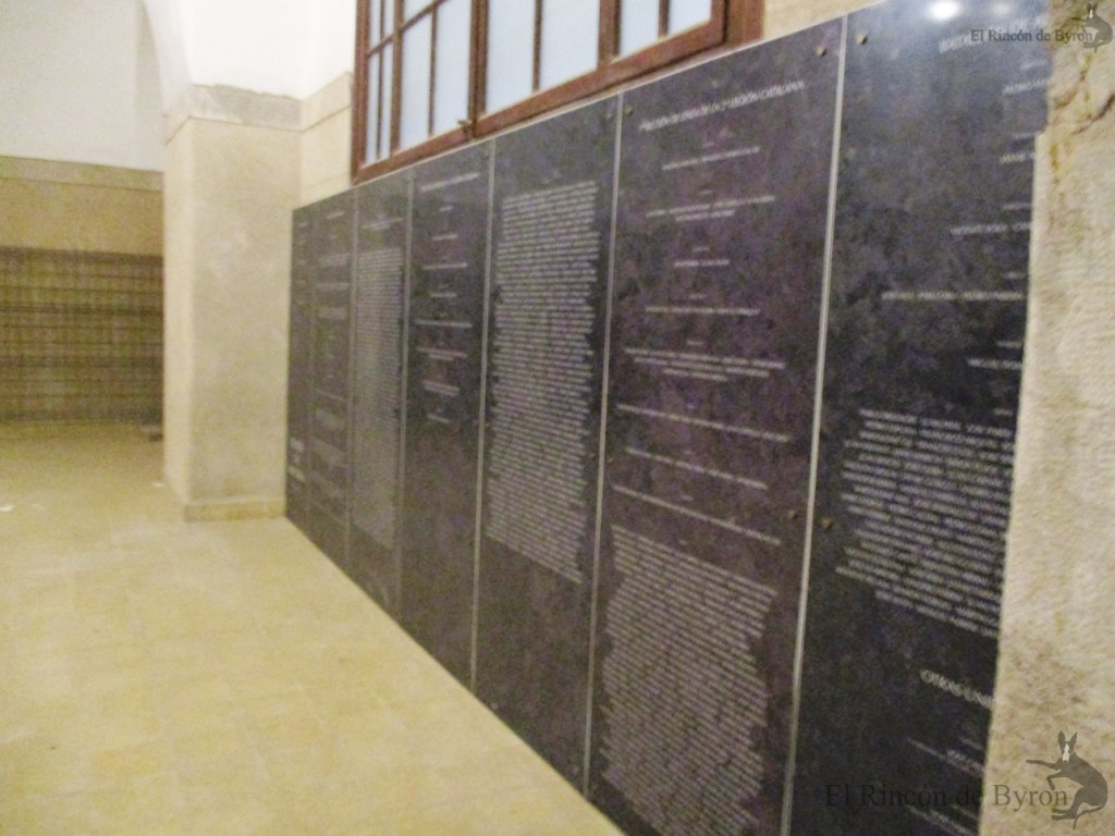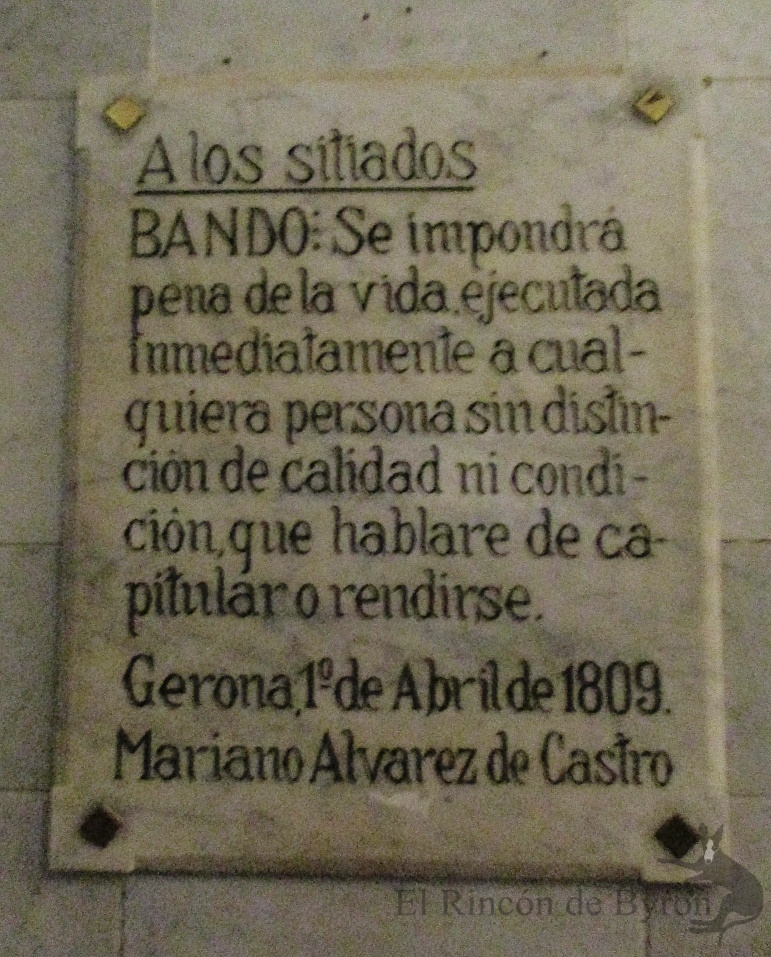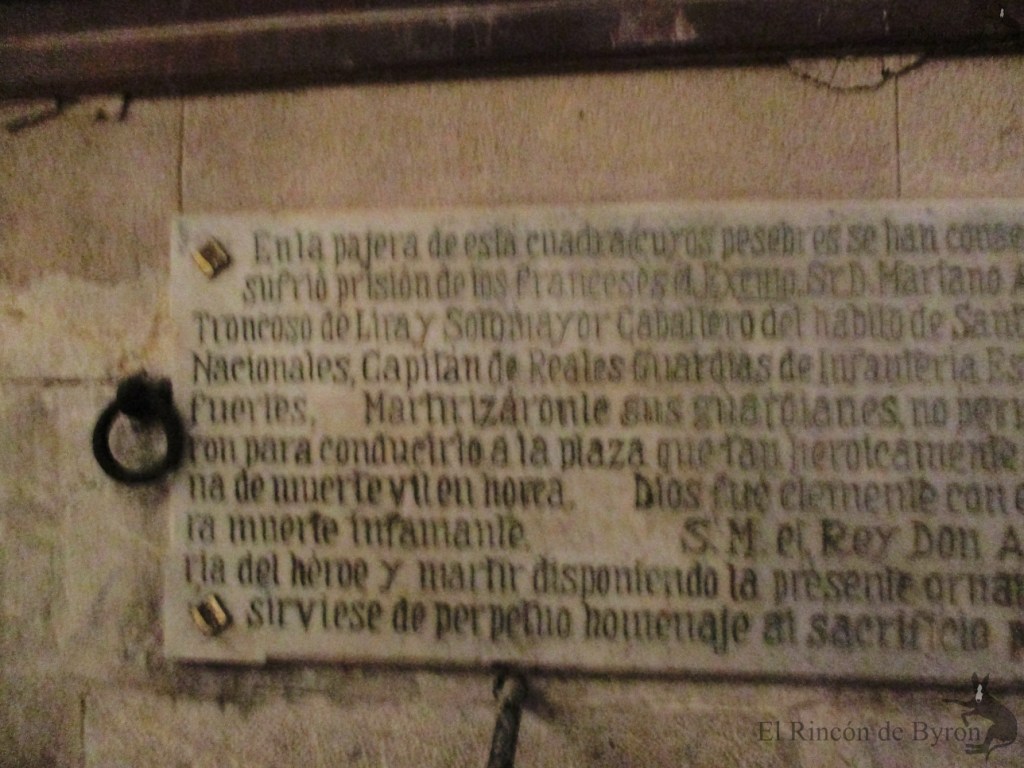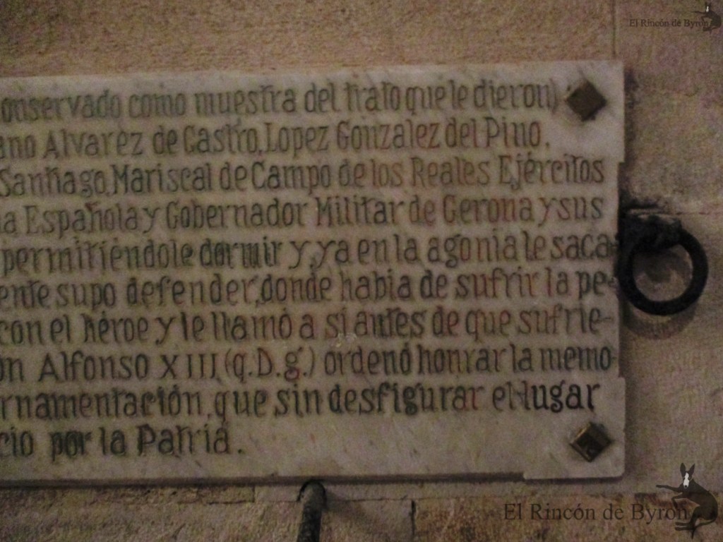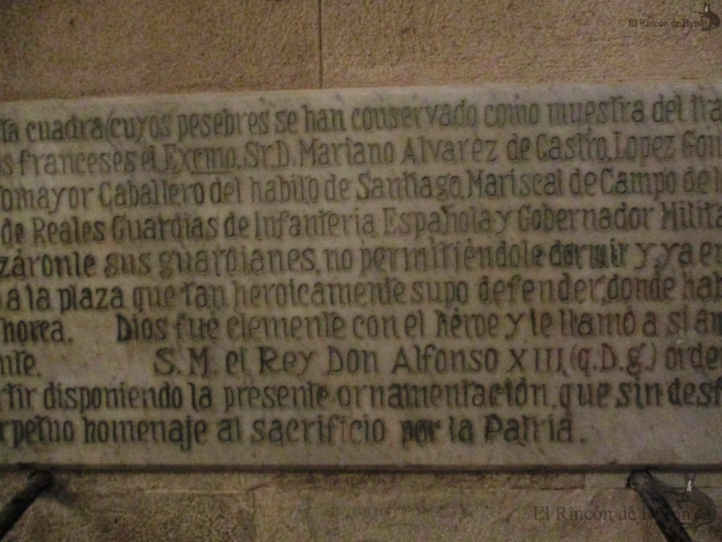 Transcripción imagen superiores: «En la pajera de esta cuadra (cuyos pesebres se han conservado como muestra del trato que le dieron sufrió prisión de los franceses el Excmo. Sr. D. Mariano Álvarez de Castro, López González del Pino, Troncoso de Lira y Sotomayor Caballero del hábito de Santiago, Mariscal de Campo de los Reales Ejércitos Nacionales, Capitán de Reales Guardias de Infantería Española y Gobernador Militar de Gerona y sus fuertes. Martirizáronle sus guardianes no permitiéndole dormir y ya en la agonía le sacaron para conducirlo a la plaza que tan heroicamente supo defender donde habría de sufrir la pena de muerte vil en horca. Dios fue clemente y le llamó a si antes de que sufriera muerte infamante. S.M el Rey Don Alfonso XIII (q.D.g.) ordenó honrar la memoria del héroe y mártir disponiendo la presente ornamentación que sin desfigurar el lugar sirviese de perpetuo homenaje al sacrificio por la Patria«