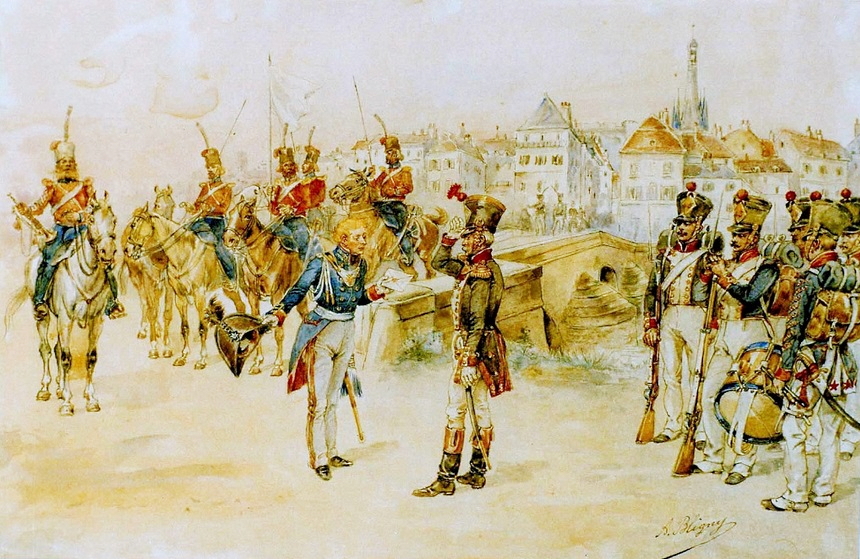 Observemos la composición. Nos encontramos en 1814. Previamente algunos meses atrás, en octubre de 1813, el ejército francés sufrió una dura derrota en «La batalla de las Naciones» en Leipzig. En 1814, los aliados de la 6ª coalición (Inglaterra, Austria, Prusia, Rusia y Suecia) invadieron Francia y, el 31 de marzo entraron en Paris. Una vez más, el enemigo ha seguido el Marne y pasa por Château-Thierry. Esta estampa ilustra un episodio local de la invasión de 1814. Se aprecia un parlamentario ruso que se presenta en el puente del Marne, en el lugar donde se situa la calle Carnot. Sombrero en bajo, el ruso tiende una misiva de rendición al oficial francés. Entre los tejados de las mansiones burguesas, se distinguen las altas murallas del viejo castillo. A la derecha de la composición, un vestigio de un antiguo señorío construido en 1480 y sirviendo de campanario urbano, la torre Bahlan vestida con la elegante silueta de su flecha tocada por ocho lados, con un linterna. Ningún rastro de violencia: todo pasa entre gentes de buena compañía: el gesto de los oficiales es cortés y deferente, los soldados del Imperio incluso tienen una sonrisa. ¡Con todo, una ceremonia agradable! Bajo el puente, el Marne discurre tranquilamente, indiferente a los conflictos humanos…1