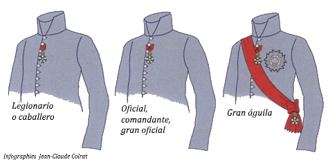 – 1805, 30 de enero. – Creación de una quinta clase, la de las \»grandes decoraciones\» o grandes águilas. Estos dignatarios llevan al mismo tiempo varias insignias: el uniforme de oficial; una franja roja usada desde el hombro hasta la cadera a la izquierda, colgando del nudo del extremo, una cruz de oro que se distingue por sus puntas puntiagudas, la efigie imperial, la cabeza girada hacia la izquierda y un modelo de 82 mm; una placa de plata (en metal, en bordado o mezclado) en el lado izquierdo del pecho decorado con el águila imperial en el centro rodeado por el lema HONOR Y PATRIE en exergo.
