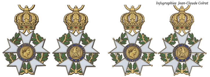 – 1804, 2 de diciembre. – Para su coronación, Napoleón viste un gran collar compuesto por dieciséis águilas de oro sosteniendo en sus garras un rayo y teniendo la cruz de honor en oro colgando de su cuello con una cinta roja esmaltado, con una estrella colgante de la orden de modelo grande.