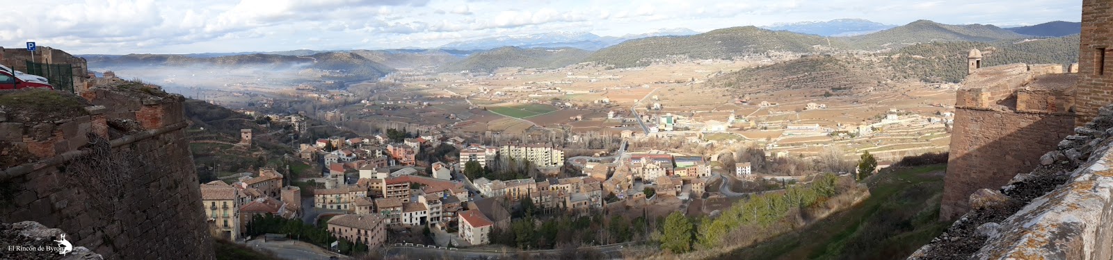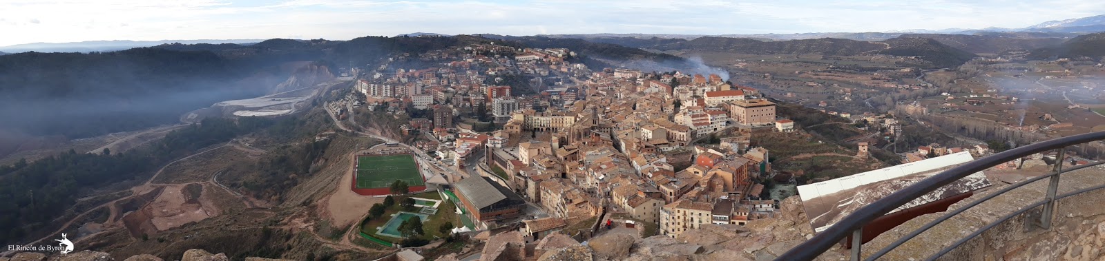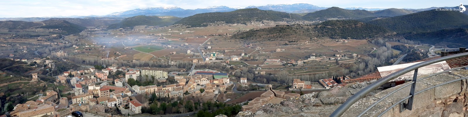 | Visión panorámica de Cardona desde la Torre de la Minyona. A la izquierda se distingue la montaña de sal y el valle salino. Recto en el horizonte se encuentra la villa de Cervera. |