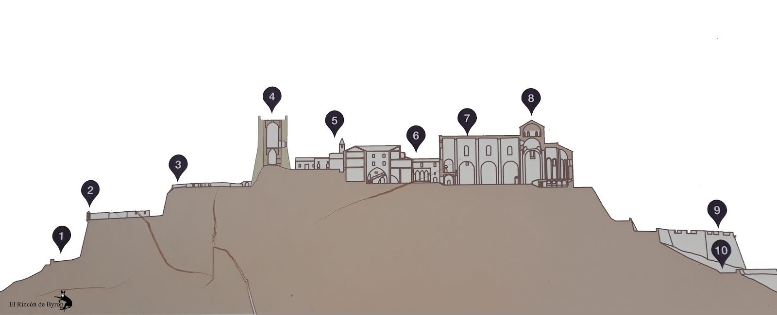 En la representación volumétrica de la izquierda se destacan los principales elementos: La Torre de la Minyona (o torre de la Muchacha) (1), el patio medieval (2), el claustro (3), la canónica de San Vicente (4), la casamata (5), rampa de entrada (6), perímetro exterior (7), montaña (8), bajada al pueblo (9), parador y punto de información (10).