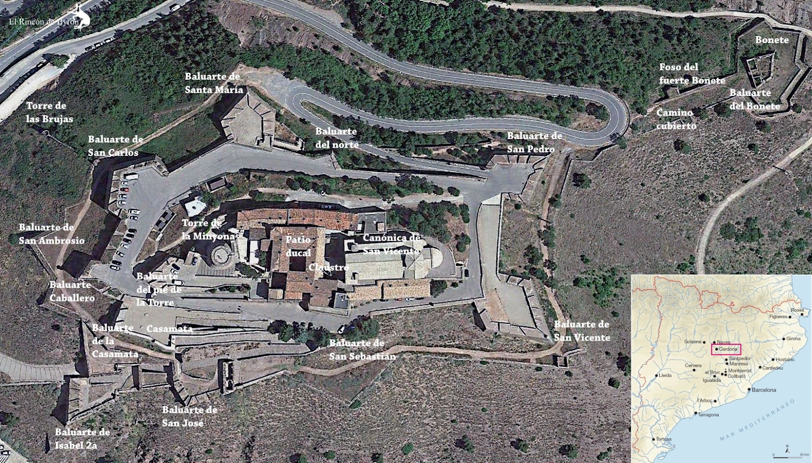 | Vista cenital del Castillo de Cardona, con las denominaciones de mediados del siglo XIX. |